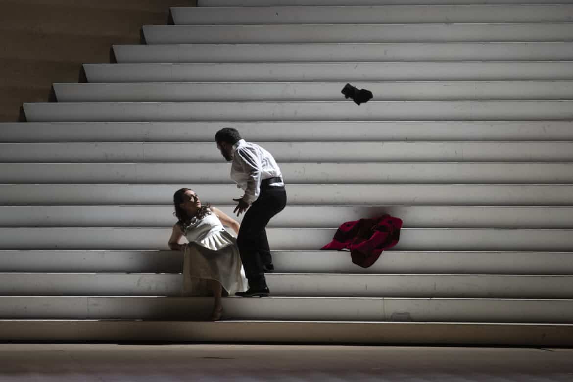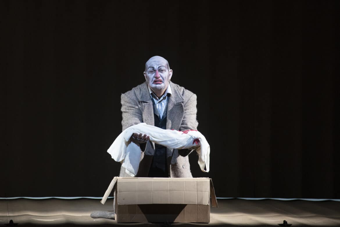 Cette quatrième série de représentations de la mise en scène de Claus Guth, après celles des printemps 2016 et 2017, et de l’automne 2021, reconduit la boîte en carton recueillant les souvenirs de Rigoletto que trimballe son double, incarné par le comédien Henri Bernard Guizirian, reconfirmé au fil des années. La rédaction en ayant déjà rendu compte à deux occasions (ici, et là), bornons-nous à rappeler les costumes Renaissance de la fête à l’acte I (Christian Schmidt) et les projections et la chorégraphie discrètes, respectivement conçues par Andi A. Müller et par Teresa Rotemberg. Seule particularité à relever : à l’exception de quelques membres du chœur, tous les hommes sont barbus. Hasard de la distribution… révélateur d’une mode propre à notre époque !