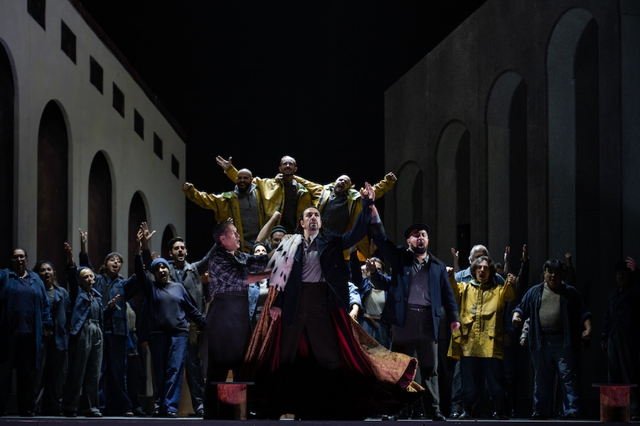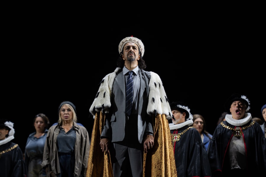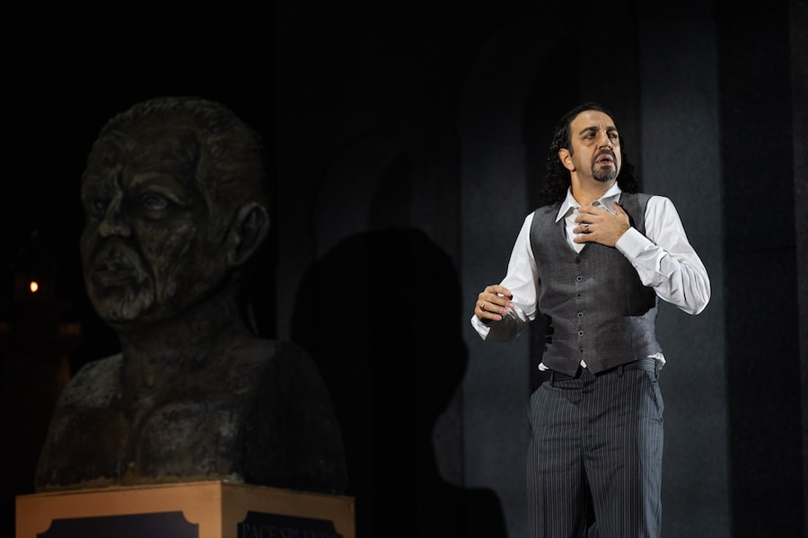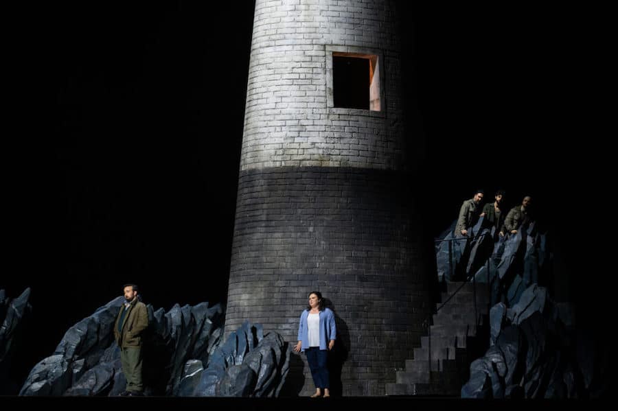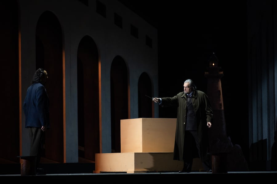 Richard Jones, dont on se rappelle certaines mises en scène importantes et ingénieuses, semble ici travailler à l’économie : sa direction ne brille pas par une tension dramatique particulière, le jeu étant laissé au bon vouloir des chanteurs ; l’atmosphère propre à l’ouvrage est presque absente du décor : on ne sait pas si l’action se situe entre les deux guerres (références au totalitarisme avec la tête monumentale du dernier acte) ou après la guerre (costumes d’Anthony McDonald et de Luis F. Carvalho qui font référence aux ouvriers portuaires pour la plèbe, mais sont « bourgeois » pour les patriciens tandis que le doge et les conseillers du sénat portent des costumes « d’époque « . Les décors de McDonald oscillent entre le didactique et le symbolique : la piazza à la De Chirico du prologue ne rappelle la ville de Gênes qu’en raison du phare ; le « salon de passage » du palais Grimaldi est situé au pied d’un phare parmi des rochers noirs et pointus ; la chambre du doge au deuxième acte se confond avec un grenier sordide décoré d’une misérable tapisserie ; l’intérieur du palais ducal au troisième acte est remplacé par la piazza (tout se passe dans la rue) ; du catafalque sur lequel gît le cadavre de Maria, Amelia se lèvera pour que le doge mourant puisse s’y allonger à son tour. Les lumières d’Adam Silverman changent les lueurs de l’aube s’estompant en une nuit sombre ; une chorégraphe a été sollicitée pour les mouvements de mime et un maître d’armes pour les affrontements entre roturiers et patriciens, inutilement représentés sur scène alors que le livret ne prévoit pas leur présence. Et que dire de ce rideau ressemblant à du carton, de ces fenêtres et de cette porte découpées….