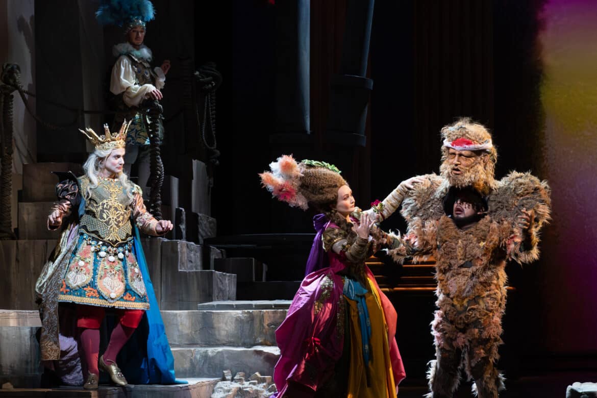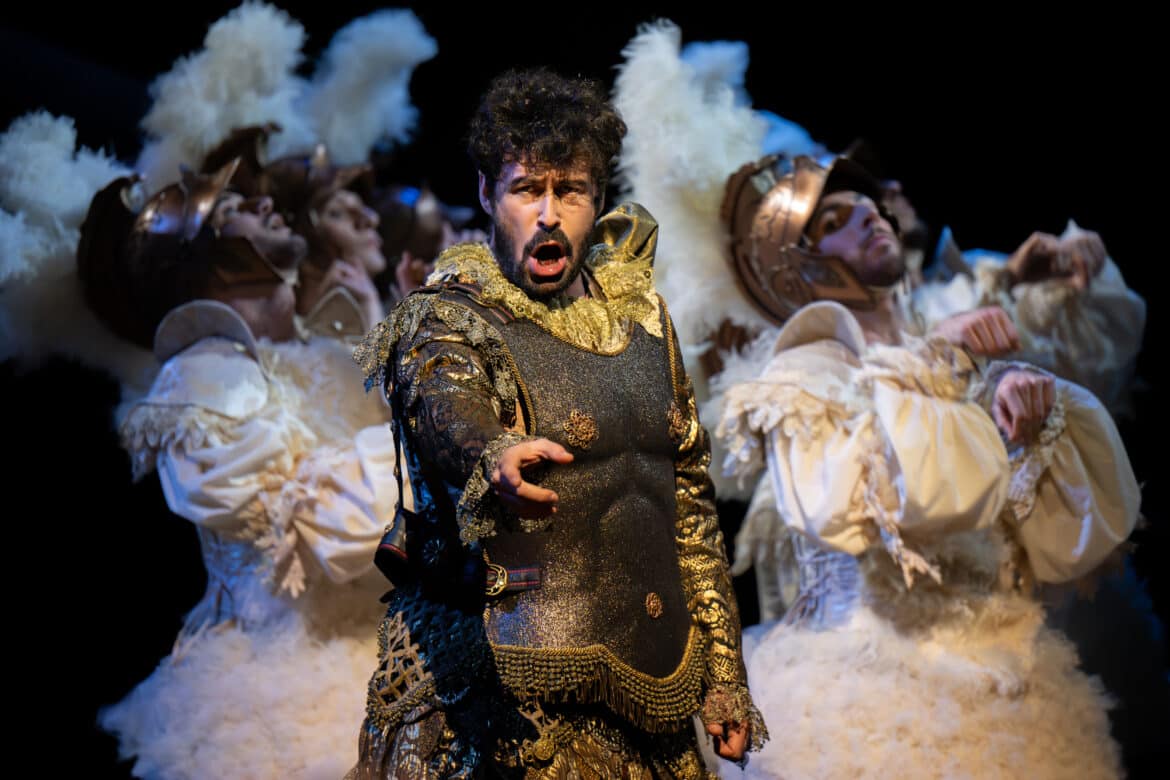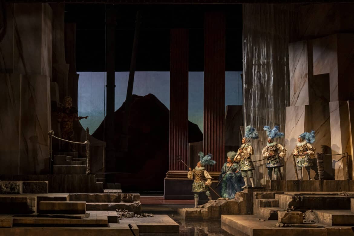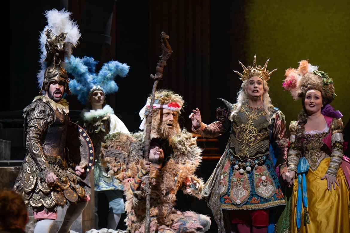 Dans une mise en scène de Julien Way maniant davantage l’humour que l’originalité (malgré la présence de vrais moutons et chèvres sur scène lorsque qu’Ulysse chante ces « heureuses brebis » !), dans de subtils éclairages de Stéphane Le Bel, avec des décors de Roland Fontaine plus fonctionnels qu’inventifs, ce sont bien les somptueux costumes de Christian Lacroix, réalisés et réinterprétés d’après des gravures d’époque, qui donnaient le La d’une soirée colorée, festive et définitivement néo-baroque. Plumes et fausses armures, robes incroyables de couleurs et de finesse de réalisation participaient à l’enchantement. Et l’étonnant personnage de Polifemo était campé par une réalisation inventive lui donnant une vraie originalité théâtrale.