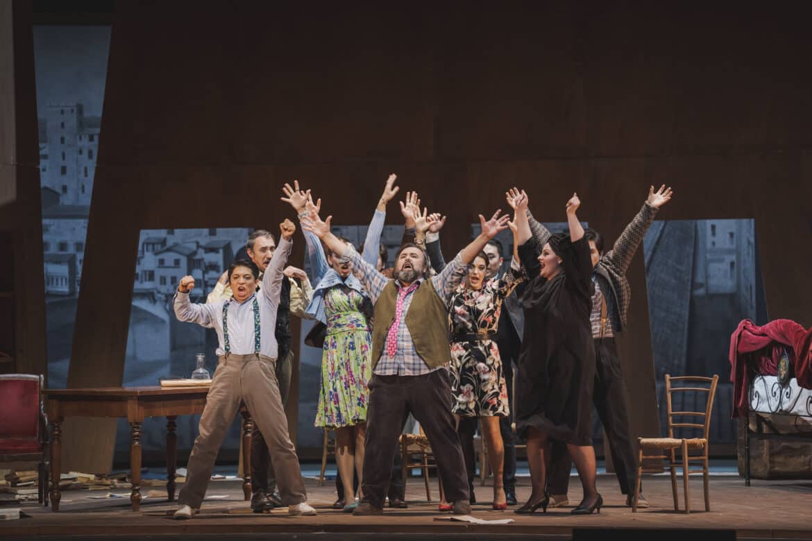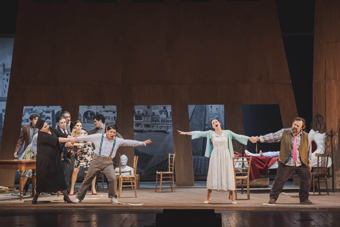 Gianni Schicchi, on le sait, est un joyau comique, dans lequel l’art et l’ironie de Puccini sont bien soutenus par le livret plein d’esprit de Giovacchino Forzano (qui a longtemps vécu à Florence), inspiré d’un personnage qui apparaît dans le chant XXX de l’Enfer de Dante. L’interaction entre texte et musique fonctionne toujours, à condition que celui qui assume le rôle du protagoniste ait un peu d’autorité. Un talent qui ne manque pas chez Roberto De Candia, soutenu par une distribution jeune et très talentueuse (Lauretta : Julia Muzychenko ; Zita : Valentina Pernozzoli ; Rinuccio : Iván Ayón Rivas ; Gherardo : Yaozhou Hou ; Nella : Nikoletta Hertsak ; Gherardino : Walter Zecca – ce sera Gregorie Zaric les 18 et 22 –, Betto di Signa : Gonzalo Godoy Sepúlveda ; Simone : Adriano Gramigni ; Marco : Yurii Strakhov ; La Ciesca : Aleksandra Meteleva : Maestro Spinelloccio/Messer Amantio Di Nicolao : Davide Sodini ; Pinellino : Huigang Liu ; Guccio : Michele Gianquinto).