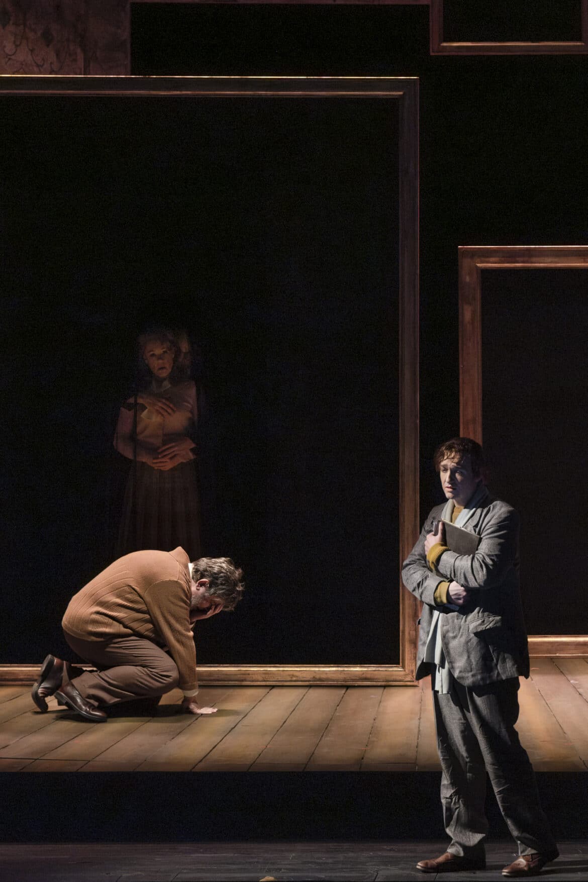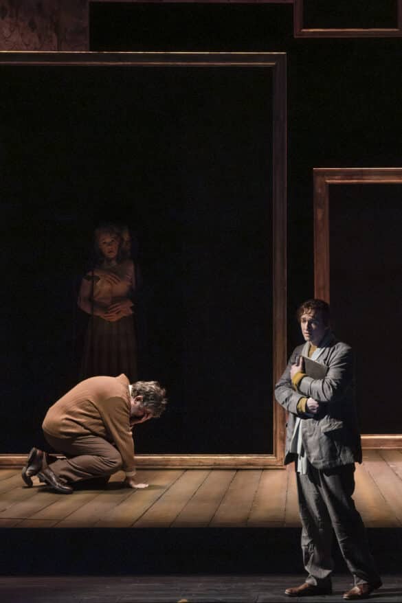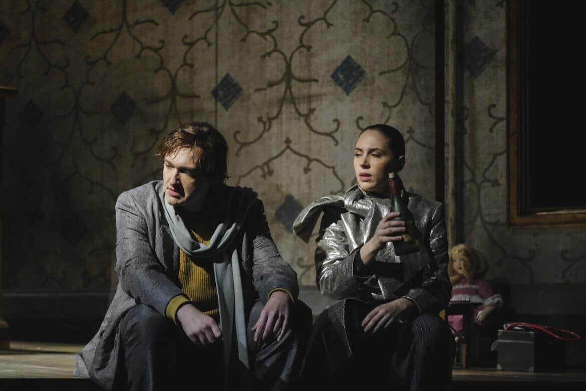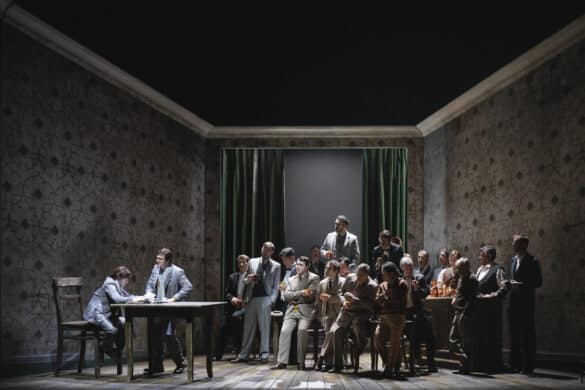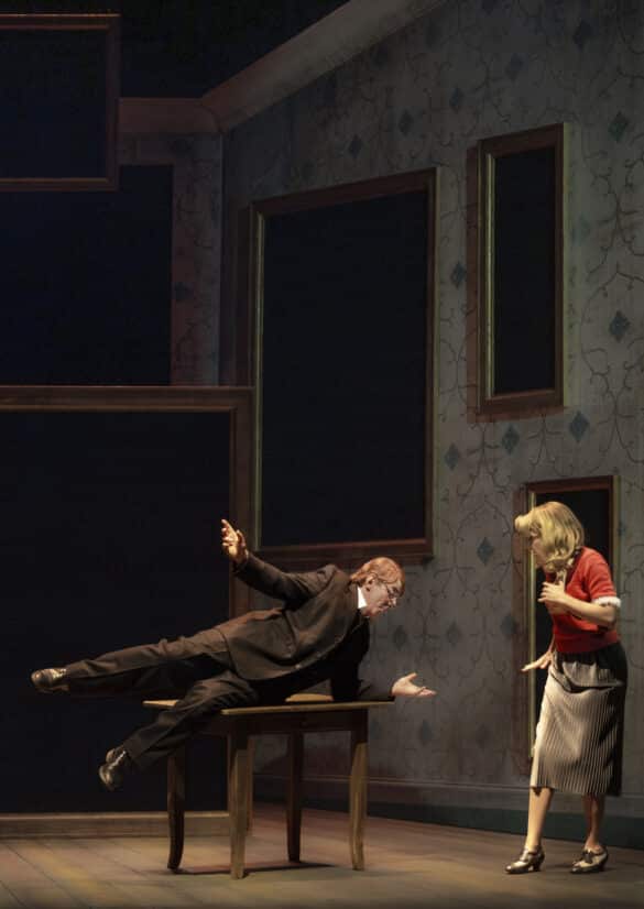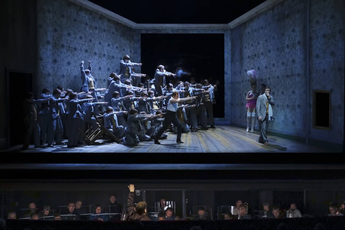 Prise à bras-le-corps, la quadruple narration des contes s’arrime à un cadre unique de scène, propre à camper le passage du réel familier vers le fantastique ou l’onirique (les récits d’Hoffmann). Ce cadre scénique, espace intime au papier peint « bourgeois », se réduit dans une focale serrée vers le rideau de fond de scène, susceptible de s’animer pour l’entrée d’acolytes. Devant, l’espace neutre du manteau de scène accueille le tandem Hoffmann/ Muse lors de leur dialogue contemporain. Tandis que la lumière sculpte le cadre (Alex Brok), notamment lors de saisissants tableaux collectifs (la débauche des buveurs), des accessoires référentiels transitent entre les univers : le cabaret des buveurs (1er acte et épilogue), l’atelier du physicien Spalanzani (2e acte), le salon d’Antonia (3e acte) et l’appartement vénitien de la courtisane Giuletta (4e acte). La plupart de ces accessoires (Christof Hetzer) accusent des échelles diverses de grandeur, propres à suggérer l’onirisme des Contes-cauchemars et leur enchâssement dans l’opéra, soit les chaises de café, la poupée automate, les cadres de tableau sans peinture, franchis par des personnages passe-muraille. Avec l’adaptation du conte Reflet de miroir (acte de Giuletta), le fantastique s’étend jusqu’à la duplication des clones d’Hoffmann (choristes masculins), piégés par le collectionneur Dapertutto. Ce processus traduit-il le narcissisme du patient, englué dans les stéréotypes d’amours contrariées ? A contrario, la chosification de la poupée Olympia[1] est astucieusement déconstruite par la distinction établie entre l’automate géante sur scène et le corps réel de la chanteuse à vocalises. Une présence qu’ignore Hoffmann, prisonnier d’un désir fétichiste.