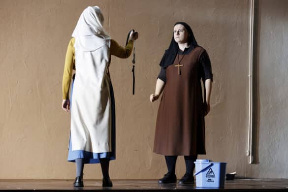 Une mise en scène réussie des Dialogues des Carmélites, c’est un défi artistique, un subtil mélange de sobriété esthétique, d’intensité dramatique et de profondeur spirituelle, tout en mettant en avant l’émotion humaine et la puissance de la musique de Poulenc. Tiphaine Raffier et la scénographe Hélène Jourdan ont décidé de remiser la sobriété au placard et de sculpter la scène en espaces variés, colorés, métalliques mais aussi épurés ou impudiques (ces toilettes et ces douches communes au sous-sol du couvent…) derrière un immense regard sur toile peinte alla Roy Lichtenstein. Pourquoi pas, mais le risque est de distraire le spectateur du drame intérieur des personnages. Les espaces de jeux deviennent ainsi une forme d’extériorisation symbolique des émotions qui surcharge parfois la narration – pourtant subtilement construite – de la metteuse en scène. Les projections de discours, arrêtés et autres plaidoiries révolutionnaires en rajoutent au côté didactique de la chose. On s’interroge alors. Pourquoi avoir voulu gommer scéniquement la période révolutionnaire si c’est pour nous la rappeler constamment par des effets extérieurs au drame ? Et cet usage de l’eau sous toutes ses formes ? Le spectateur en lira la symbolique dans le programme de salle. Tiphaine Raffier a beaucoup de choses à dire au spectateur et à faire dire aux Dialogues des Carmélites. C’est plutôt une bonne chose et l’artiste ne manque pas de ressources. C’est peut-être un peu trop.