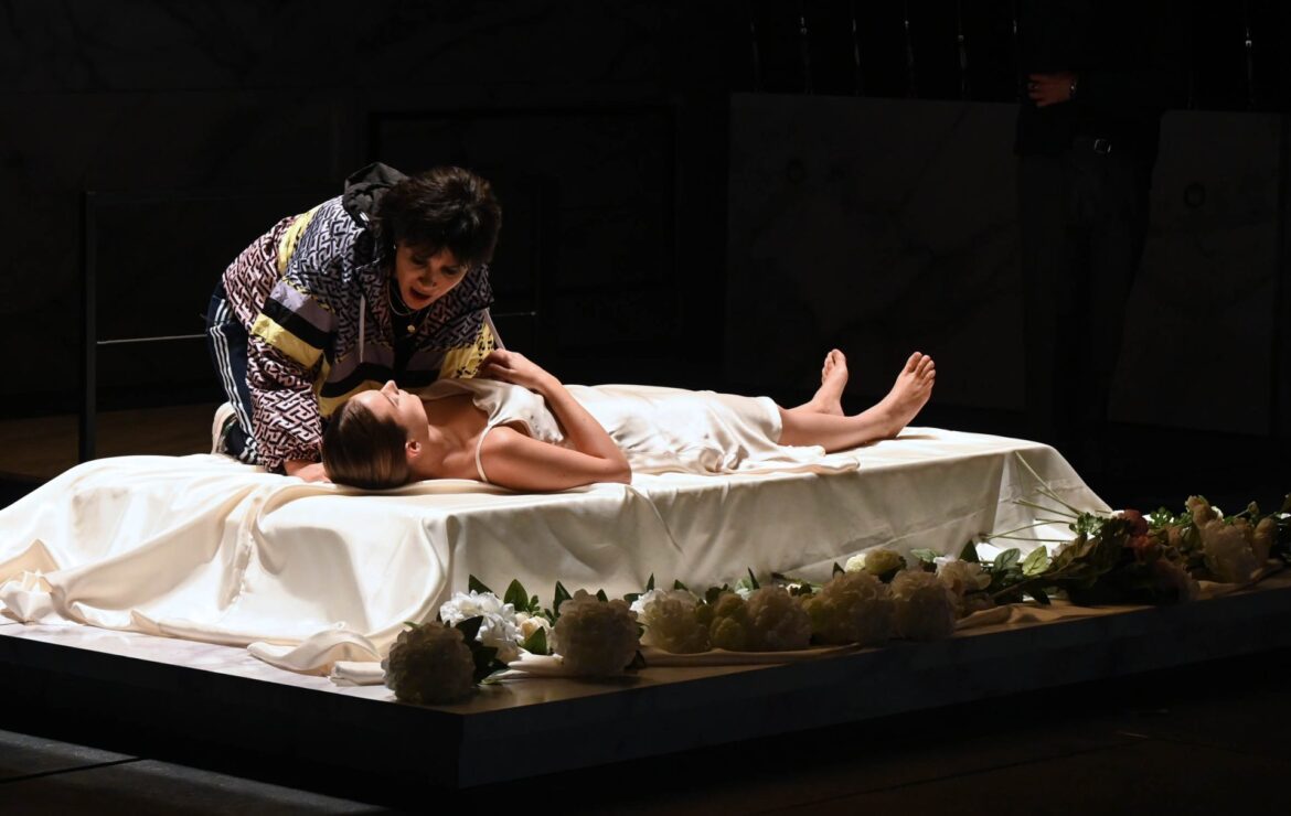 Nel 1830, Bellini aveva a disposizione soltanto un mese e mezzo per realizzare l’opera e andò ad abitare insieme al librettista Felice Romani. Il risultato fu una straordinaria fusione di musica e poesia, intrecciate in uno svolgimento drammatico tuttora efficacissimo. La tragedia che Shakespeare aveva composto tra il 1594 e il 1596, rielaborando la novella del letterato vicentino Luigi da Porto, era già stata più volte musicata e costituì per Romani e Bellini il punto di partenza per la creazione di un melodramma originale. Nel libretto sono citati Ezzelino, i Guelfi e i Ghibellini : nomi che all’epoca alludevano alle contemporanee battaglie politiche (Ezzelino da Romano era la massima personificazione del tiranno in tanti libretti del primo Ottocento). Oggi per lo più si sorvola su questi aspetti e, per attualizzare l’opera, il regista Andrea De Rosa è ricorso all’ambito calcistico-sportivo, rappresentando le famiglie dei Capuleti e dei Montecchi come due tifoserie avversarie, che affiggono striscioni o indossano sciarpe con i rispettivi nomi scritti a caratteri cubitali ; i costumi creati da Ilaria Ariemme sono semplici e informali, d’una modernità non precisamente datata ; le scene ideate da Daniele Spanò sono sobrie e monocromatiche, con un quadrilatero centrale che inizialmente costituisce il letto di Giulietta, poi diventa il suo altare sacrificale e infine la sua tomba. Intorno ad esso s’innalzano funi d’acciaio che dapprima creano una barriera con il bellicoso mondo esterno, poi reggono delle lastre in simil marmo bianche-grigie che rimandano alle pareti di un cimitero. Le luci di Pasquale Mari, rasenti e discrete, rendono ancora più efficace l’allestimento.