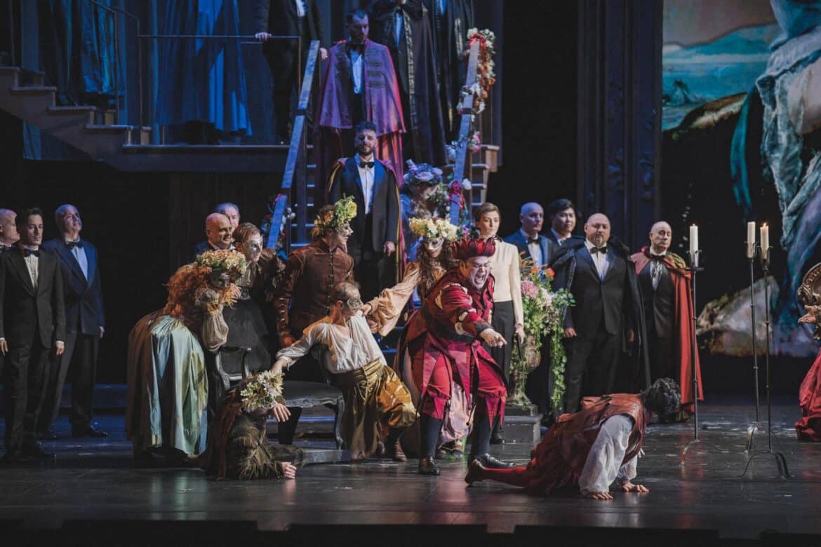 Molto buone le parti di contorno e nel complesso lo spettacolo tiene, anche se la regia di Davide Livermore, ripresa piuttosto fedelmente da Stefania Grazioli, non è di quelle che aiutano i cantanti. Fra le intenzioni dichiarate nel 2021 dal regista torinese c’era quella di rendere la vicenda ancora più cupa dell’originale: si parte dalla fine, col cadavere di Gilda a terra in una squallida stazione della metropolitana, fra tre passanti impassibili, con lo sferragliare dei treni che invade la sala subito prima che gli ottoni attacchino il tema della maledizione; poi entra Rigoletto, Gilda esce e la scena si apre su un festino in maschera (con bellissimi abiti che rinviano vagamente al XVI secolo dell’ambientazione originaria), sullo sfondo, finché si è nel palazzo del Duca, passano proiezioni di pitture sei-settecentesche variamente connesse all’azione e si sviluppa una trasposizione già attuata in passato da Jonathan Miller, che trasponeva Rigoletto in un’atmosfera da film di gangster (ma tra malavitosi della Los Angeles di metà Novecento lo ambientava anche Michael Mayer al MET una decina d’anni fa).