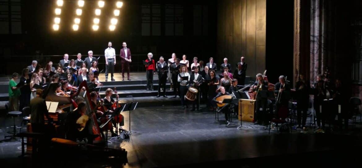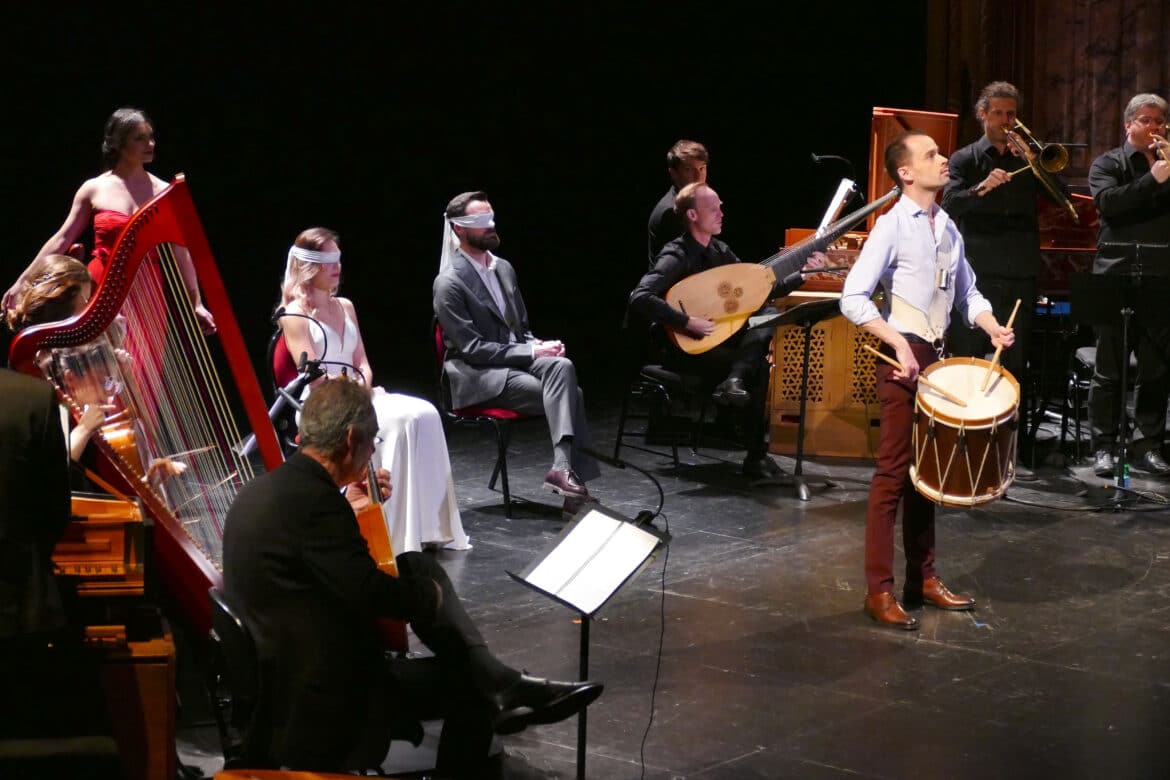 Une seule représentation, il ne fallait pas la manquer ! Un opéra baroque, dans une interprétation baroque, à l’Opéra de Marseille, cela fait songer à Autodafé, l’opéra « contemporain » de Maurice Ohana il y a une poignée d’années : des évènements rares, uniques même. Une petite déception cependant, dès l’entrée dans la salle : non, ce ne sera pas une représentation, mais une version de concert (très exactement, « mise en espace ») – ce n’était pas annoncé sur le site internet, ni sur le programme. Il aurait peut-être fallu s’en douter, certes, mais on pouvait rêver d’un spectacle baroque dans le temple provençal du conventionnel « grand répertoire ». Une version de concert au festival de Beaune, cela se comprend, vu les infrastructures, mais à Marseille, dans cette maison lyrique aux multiples ressources scéniques… On se met à espérer, lorsque des images sont projetées ; « hélas », comme le dit Orphée, « hélas… », rien d’intéressant, des effets visuels très minces ; un soubresaut de rougeurs infernales, bien académiques, par exemple. Les mouvements et théâtralisations des chanteurs sont de meilleur aloi (mise en espace Jimmy Boury). Notamment Imanol Iraola qui vient sur scène avec ses castagnettes, puis que l’on découvre dans les chœurs et peu après dans le rôle d’Apollon. Mention spéciale à ce valeureux baryton percussionniste ! Dans la rubrique poly-instrumentistes, applaudissons en premier lieu les deux très remarquables trompettistes qui sont aussi et surtout joueurs de cromornes et de flûtes ; la « seconde cromorniste » est complètement impliquée dans l’expression musicale, en phase avec le chef, c’est la musicienne la plus habitée, et incroyablement douée, n’offrant aucune fausse note sur des instruments aussi délicats, avec une infaillible virtuosité. Dommage qu’à la fin, le chef ne les fasse pas saluer individuellement. Toute la phalange des cuivres (trombones) est impeccable ; le luth et le théorbe se font nettement entendre, jouant entre autres sur les notes basses, en accord avec les clavecins et orgues (même si le régal n’est pas si effrayant, à l’instar de Charon, plus suave que terrifiant). Dans l’ensemble, l’orchestre du Concerto Soave, qui ne correspond bien sûr pas exactement à l’instrumentation originelle, restitue une palette de couleurs particulièrement riches, joue avec dextérité sur la plastique des intensités et des timbres, sous la direction du claviériste Jean-Marc Aymes (par ailleurs responsable du festival Mars en Baroque à Marseille). On aurait éventuellement apprécié plus de spatialisation, soit dans la toccata, soit dans les échos aux violons de l’air d’Orphée ; après tout, à l’opéra, cuivres et percussions investissent les loges aisément (ce fut le cas cette année pour Norma)… L’ensemble instrumental est assez restreint comparé au chœur de l’Opéra de Marseille, qui s’adonne au chant baroque…