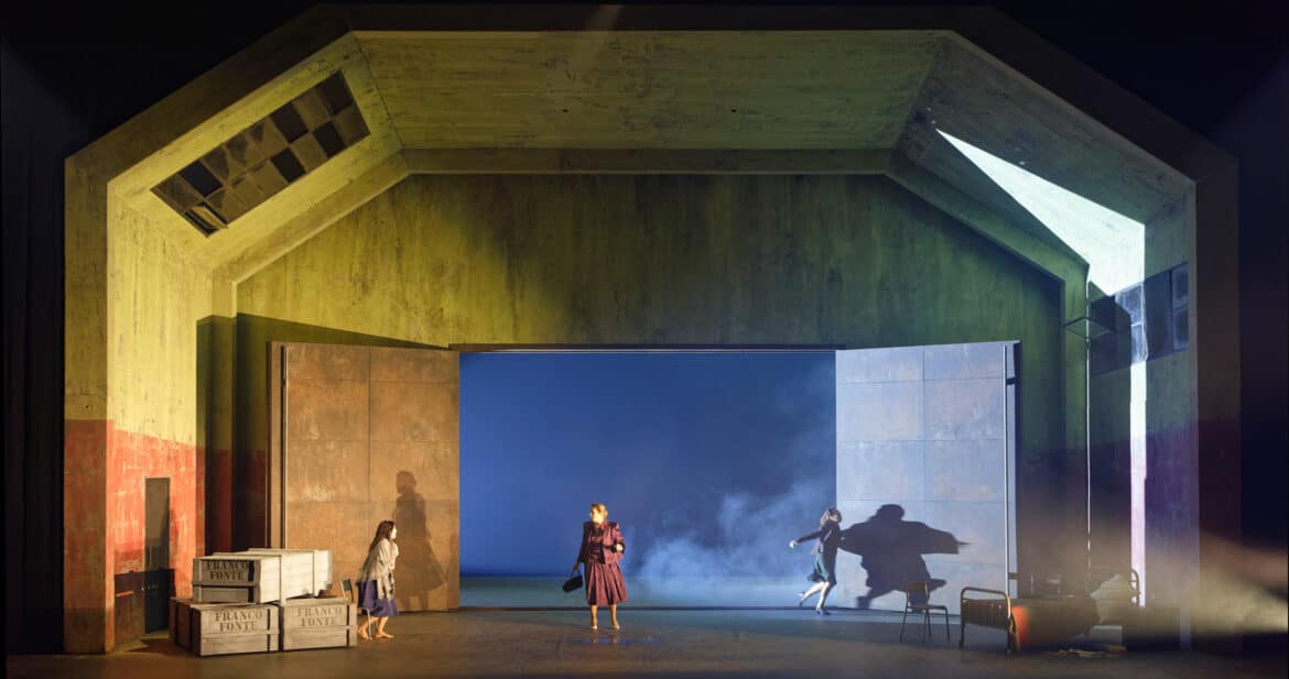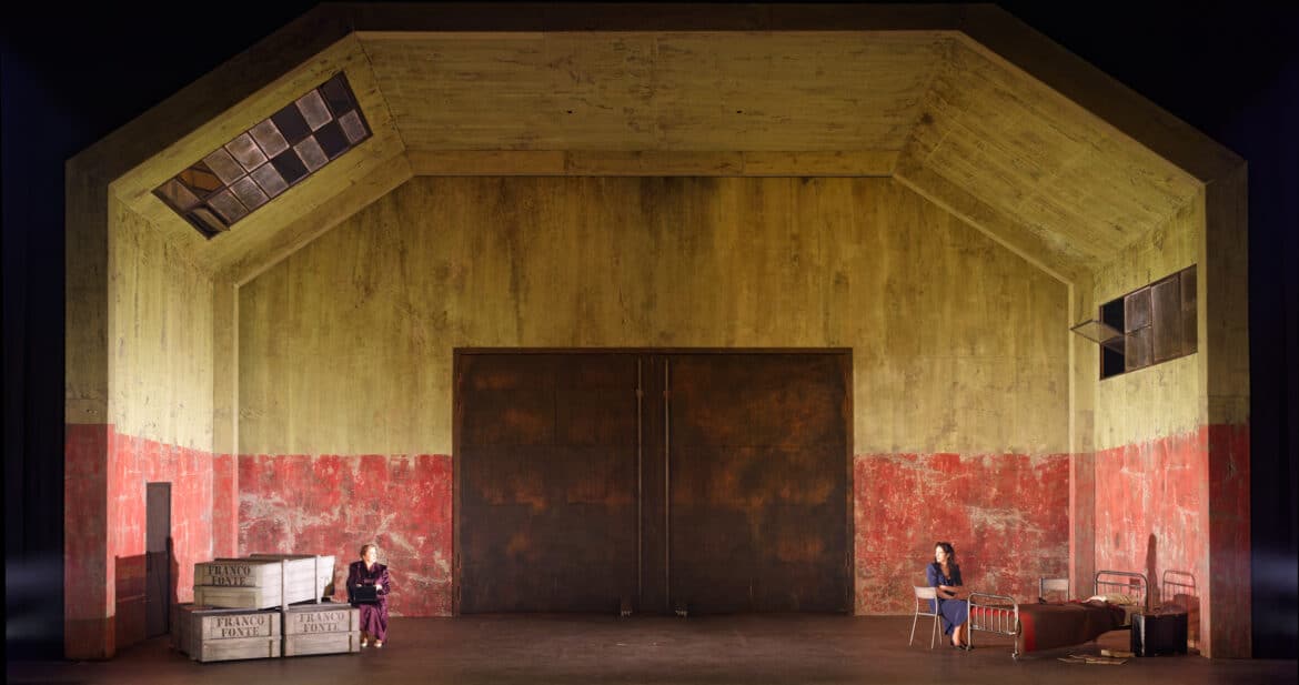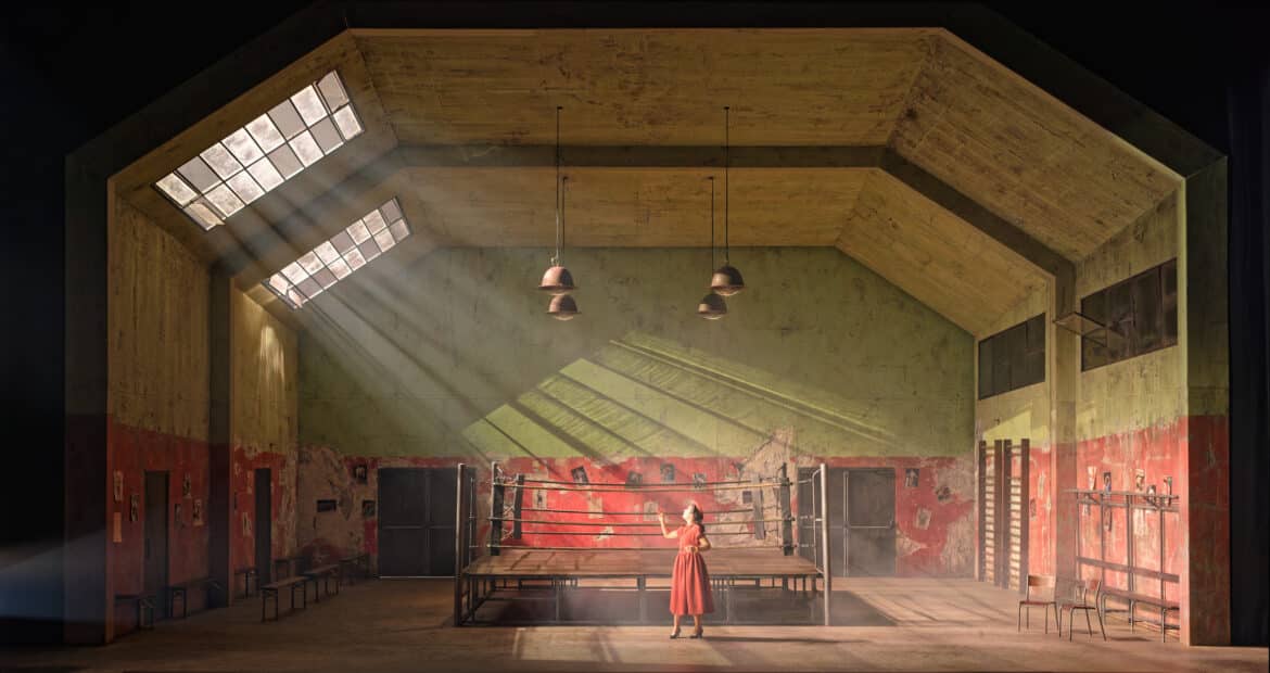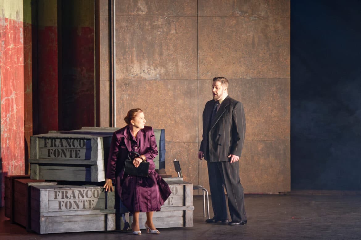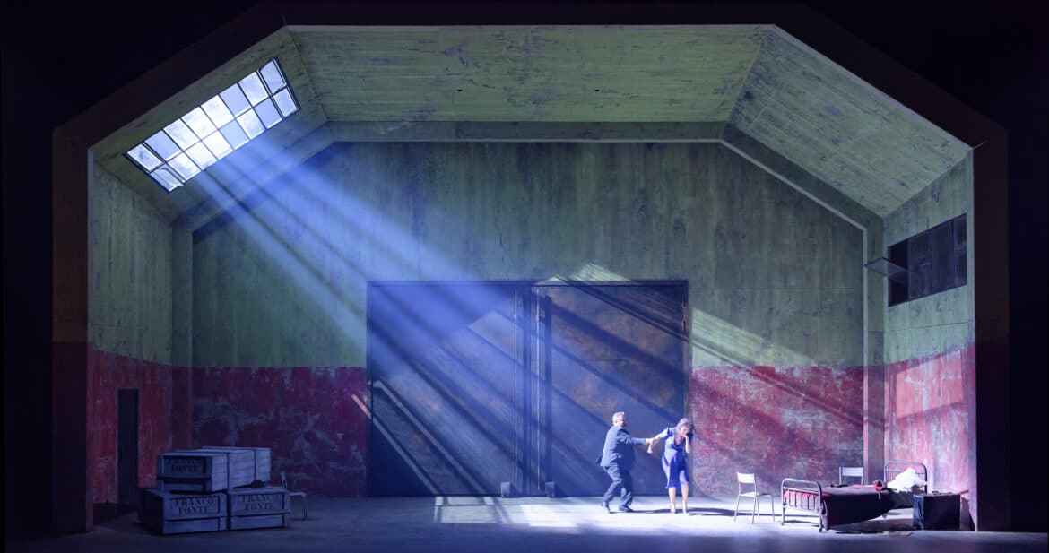 Nicola Berloffa, qui avait déjà conquis le public stéphanois avec Hamlet en 2022, signe ici une mise en scène sobre et efficace. Un travail particulier a été accordé à la direction d’acteurs et aux effets scéniques, comme la procession de Pâques, les petits pas de danse au début de I Pagliacci ou encore le jeu de scène des solistes, plutôt réussi. Les décors d’Andrea Belli plongent le spectateur dans un cadre à la fois intemporel et ancré dans la rudesse du quotidien. Un seul décor, agrémenté de quelques éléments (une cloison avec deux portes ou un ring de boxe) permet de marquer des atmosphères distinctes nécessaires pour les deux opéras. La très grande majorité des costumes, inspirés des années 60, est également réutilisée de façon ingénieuse. Les scènes de vie dépeintes sont renforcées par les jeux de lumière soignés de Valerio Tiberi, mettant en valeur différentes facettes des personnages entre ombre et lumière. Tout est là pour passer un moment agréable.