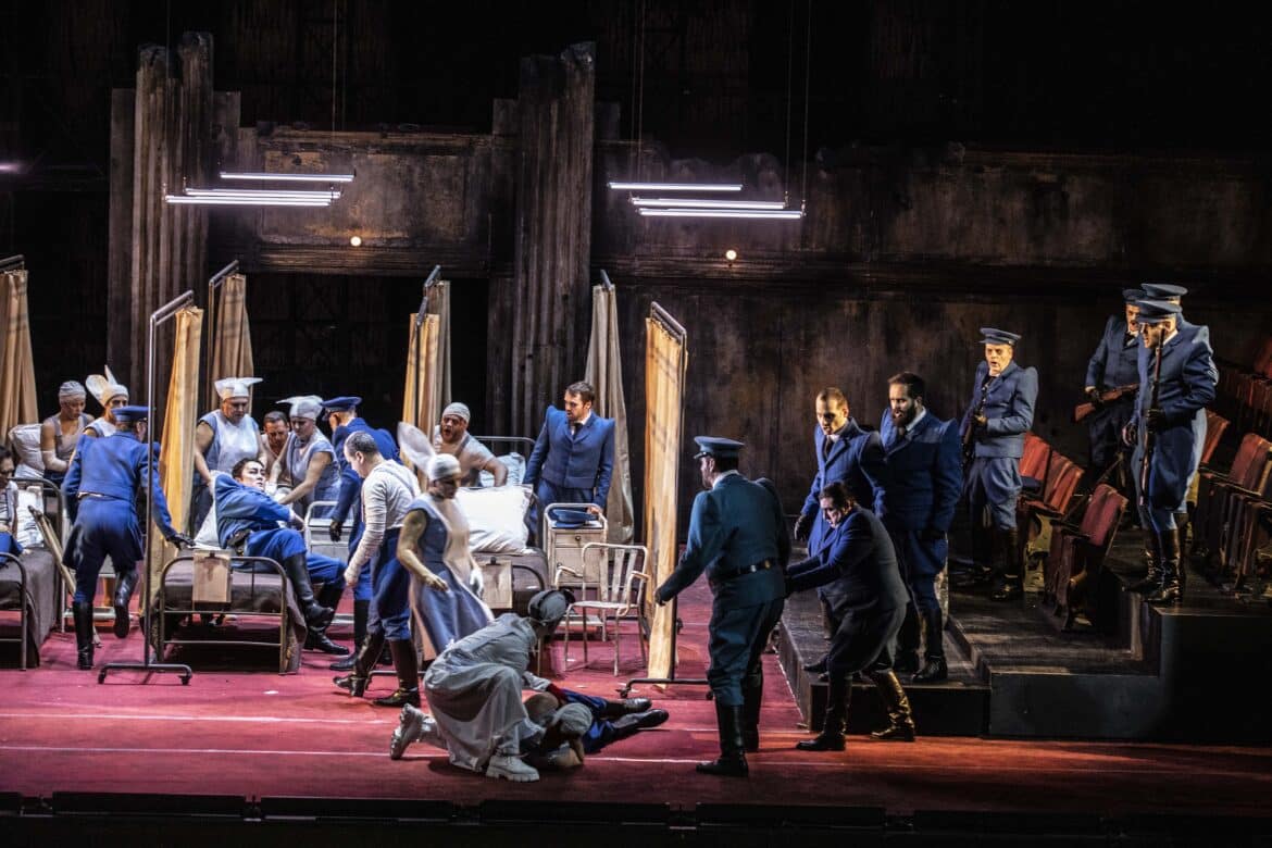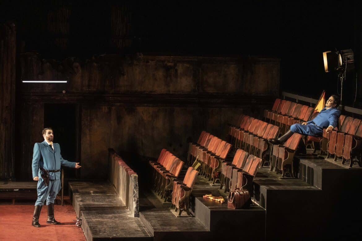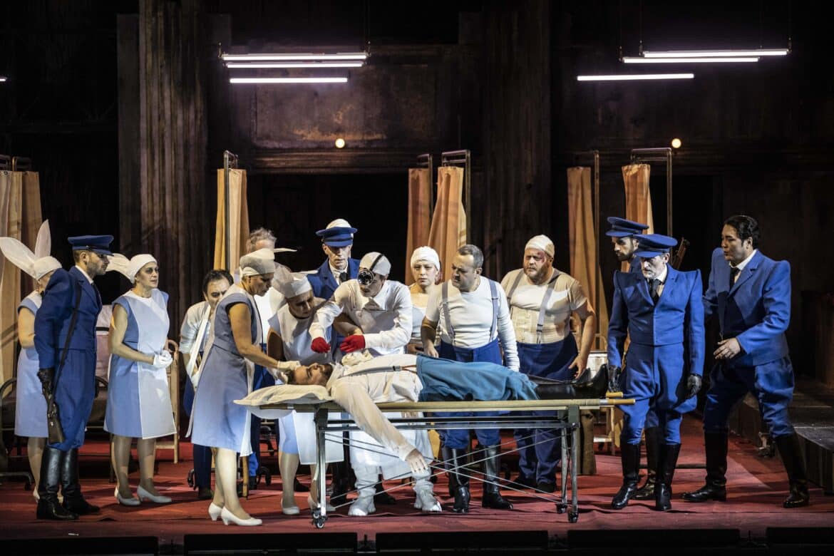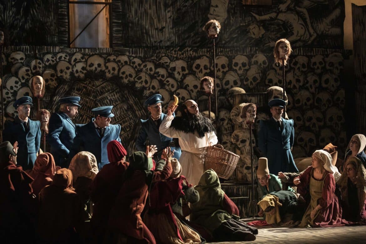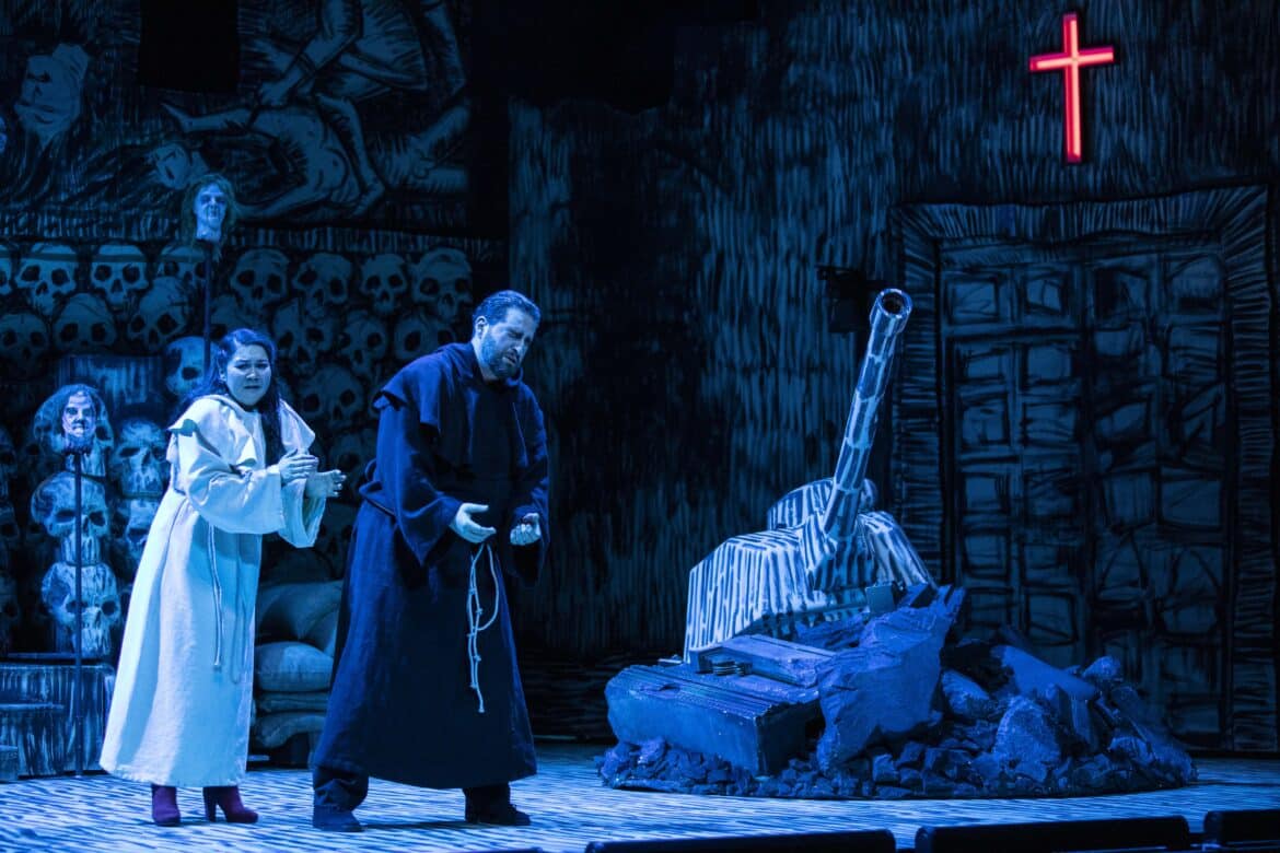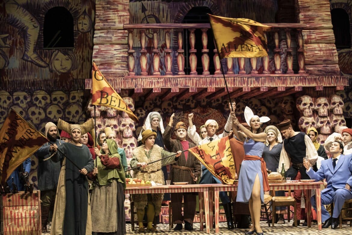 Cette dimension hybride – présente dès la célébrissime ouverture – est très bien rendue par la vision grandiloquente de Ersan Mondtag qui évoque tout à la fois les méandres des architectures d’un Piranèse pour le premier décor et les constructions néo-baroques du Palais du Facteur Cheval mâtinées d’esprit bédéiste pour le deuxième décor, dont les centaines de têtes de mort (calavera en espagnol, un clin d’œil au marquis de Calatrava tué au début de l’opéra ?), notamment sur la toile peinte, font penser, stylistiquement, aux hallucinations d’un James Ensor. Une mise à distance que rend bien le tableau du campement militaire où les soldats assistent en spectateurs, assis sur des gradins latéraux, aux péripéties du tableau. Il y a une forme d’ingénuité dans la vision du jeune metteur en scène berlinois qui est parfaitement conforme à l’esprit de l’œuvre : même les drames romantiques les plus noirs frisent avec le ridicule.