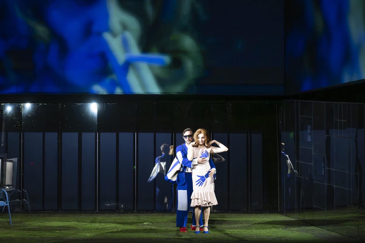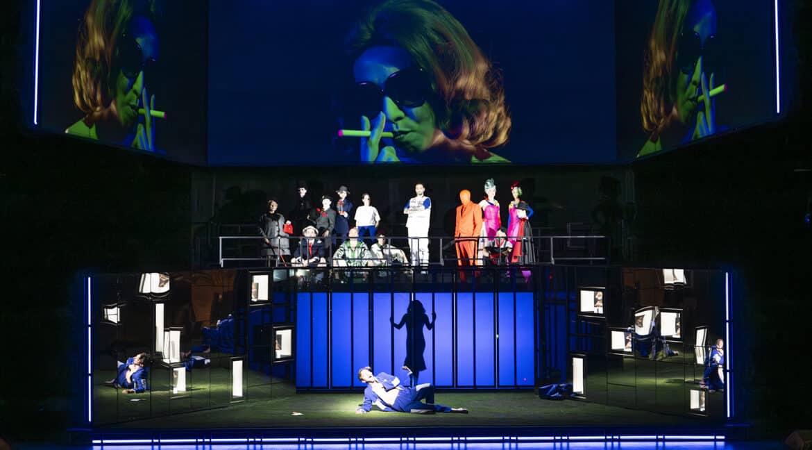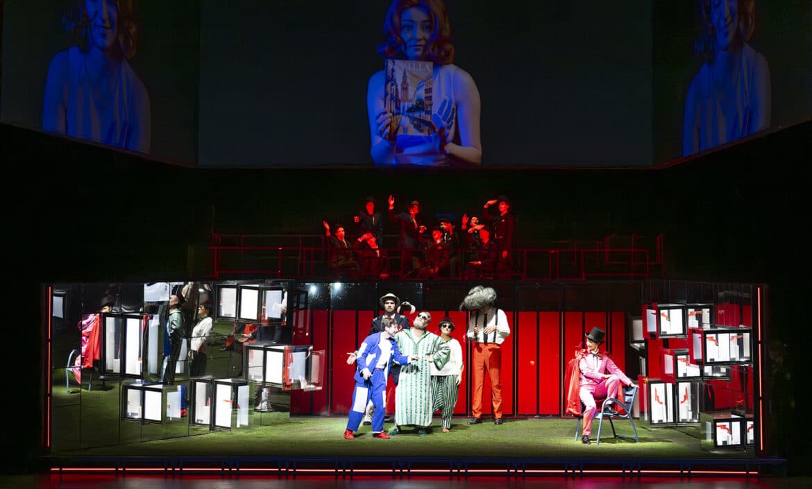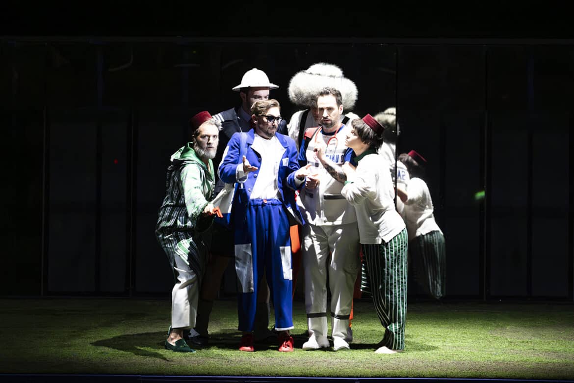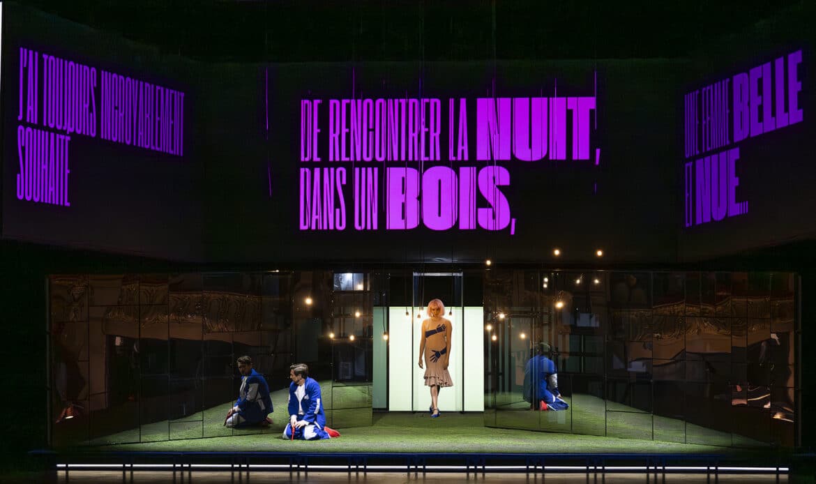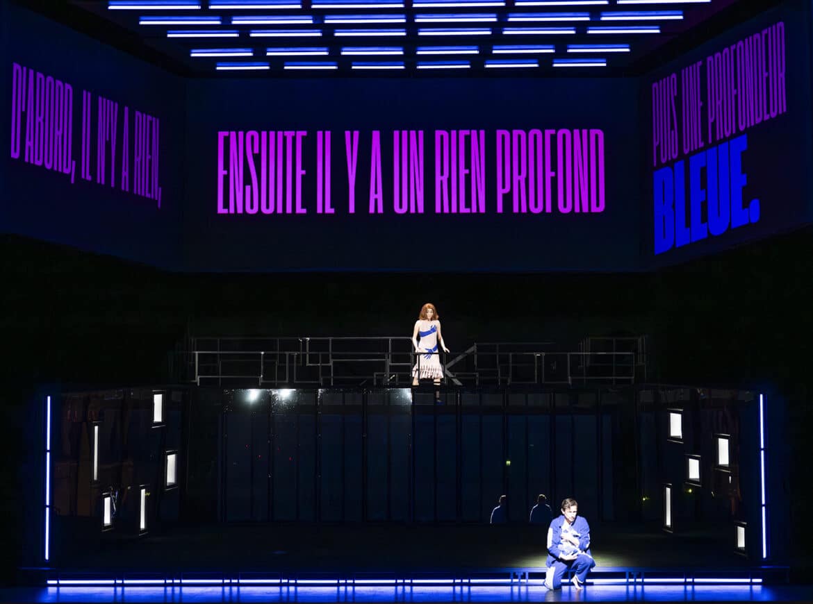 Dans un tel dispositif scénographique, renforcé par la projection, en lettres capitales quasi-psychédéliques, de formules en partie empruntées à la vulgate surréaliste voire bachelardienne (« Le surréalisme est à la portée de tous les inconscients » / « D’abord, il n’y a rien, ensuite un rien profond, puis une profondeur bleue. »), la direction d’acteurs doit être au cordeau, si l’on ne veut pas perdre le spectateur, et ce d’autant plus que, dans cet opéra, le grand nombre de personnages – dont la plupart ne font qu’une seule apparition ! – rend la narration souvent complexe. En confiant plusieurs rôles à une distribution ramassée, l’équipe de production parvient à éviter cet écueil, tout en conservant leur originalité bigarrée au caractère intemporel des costumes choisis.