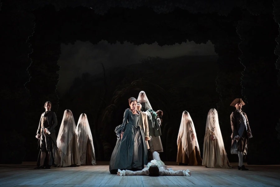 De fait, les décors sont pleins de beauté : au premier acte, les ailes peintes encadrent une scène fixe avec un épais feuillage vert pour recréer le « lieu désert » et le « picciol antrum » de l’île, tandis que les élégants costumes du dix-huitième siècle sont en soies sobres de couleur pastel. Rien d’autre sur scène : tout est laissé au jeu des acteurs-chanteurs, à leurs regards, à leurs mouvements travaillés. La dynamique psychologique des personnages est claire dès le premier instant : l’amour possessif d’Alcina pour Ruggiero ; la passion d’Oronte pour Morgana, qui est tombée amoureuse de Ricciardo, Bradamante en travesti ; la dévotion de Bradamante pour son Ruggiero ; l’affection sincère d’Oberto pour son père décédé. Les enchevêtrements personnels se reflètent dans les mouvements des personnages qui se déplacent rapidement entre les coulisses et la scène, créant ou défaisant les relations.