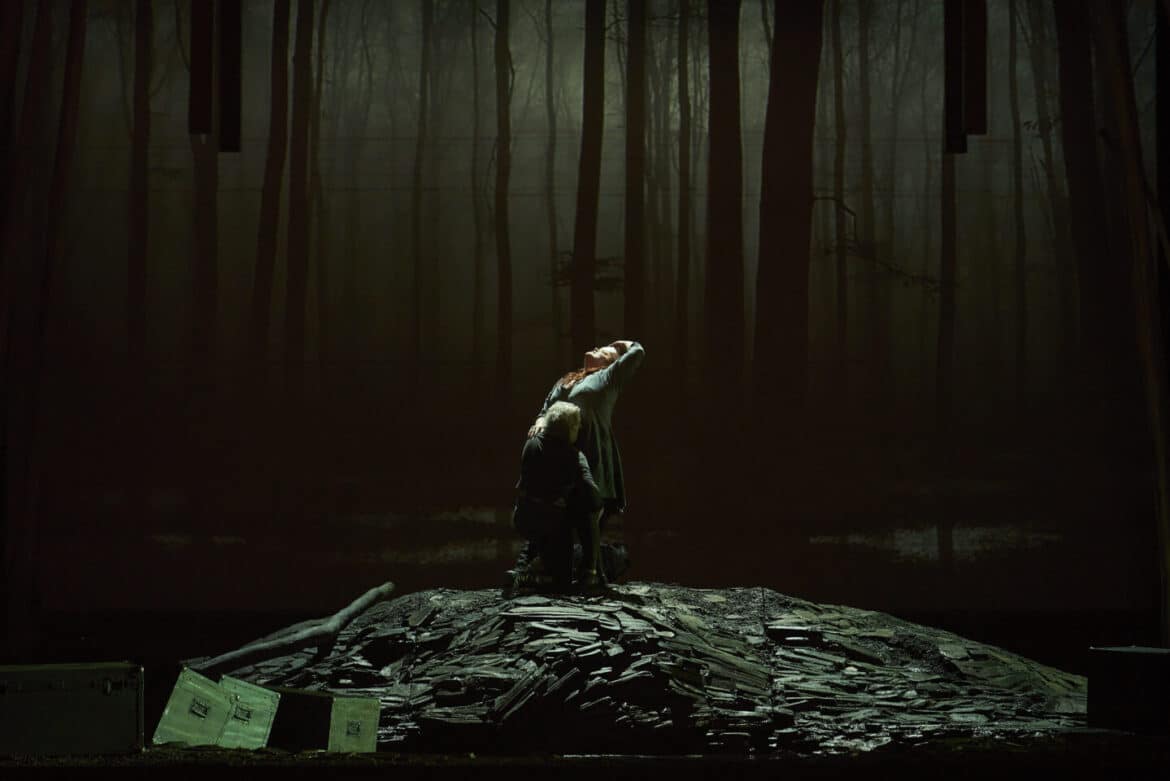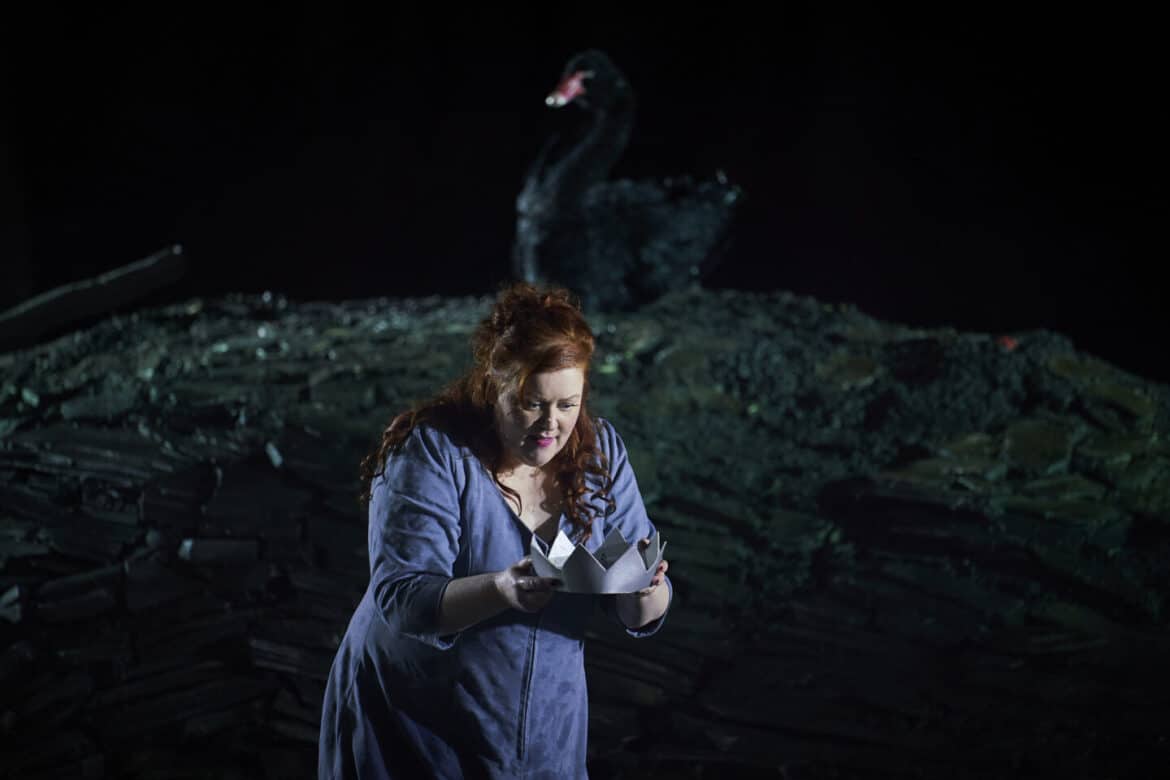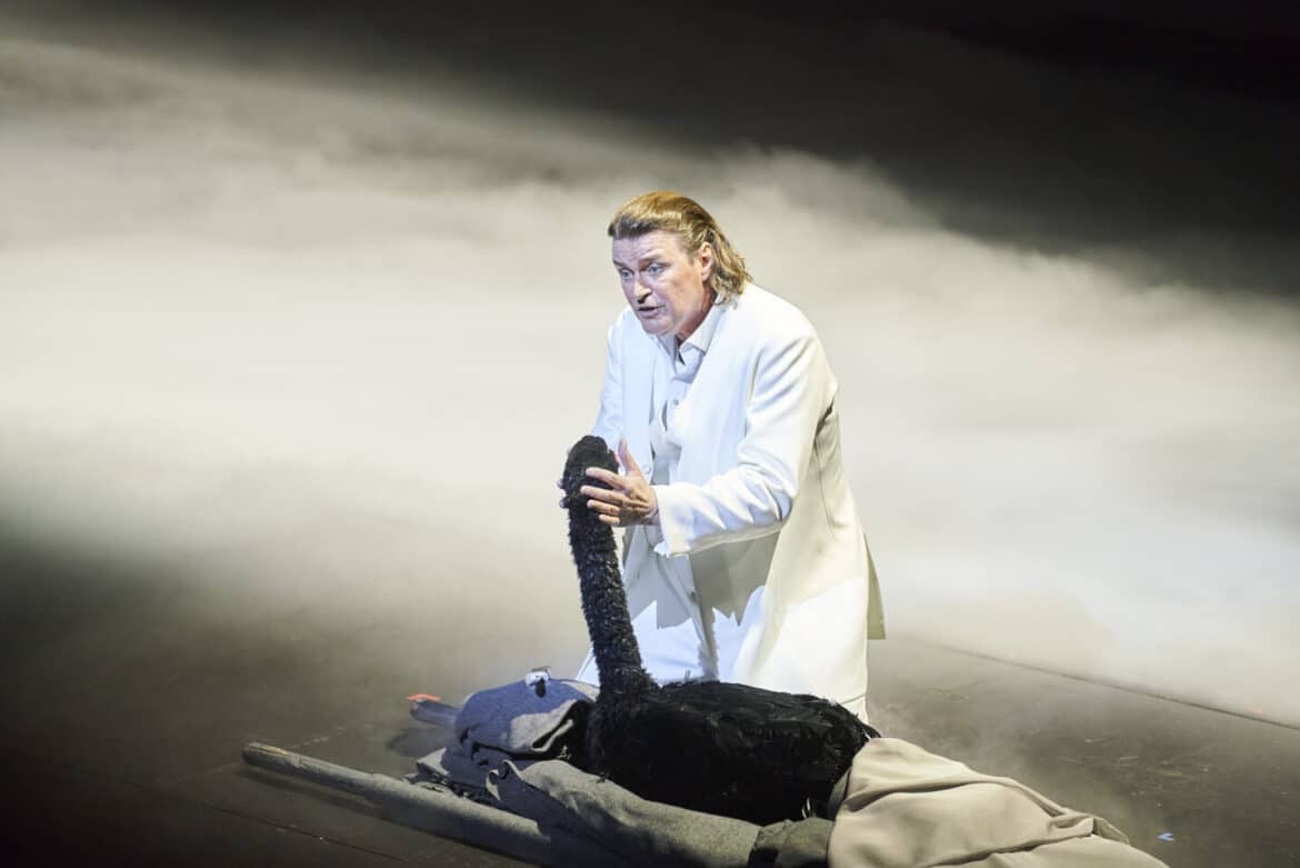 Dès le lever de rideau, l’ambiance sombre s’impose. Le spectateur se retrouve face à une forêt morte, où trône, sur une petite colline de terre, un cygne noir immobile, veillant sur un étang aux eaux opaques. Pendant l’ouverture, Elsa et son frère jouent avec insouciance, mais très vite, Lohengrin apparaît et attire l’enfant près de l’eau pour faire des ricochets. Quelques instants plus tard, il l’attire doucement dans l’étang et le noie froidement sous nos yeux médusés. Le corps de Gottfried disparaît dans les profondeurs tandis que Klaus Florian Vogt, immergé jusqu’à la taille, récupère la couronne de l’enfant et l’enterre devant le cygne noir, témoin silencieux du crime, alors qu’Elsa dort paisiblement.