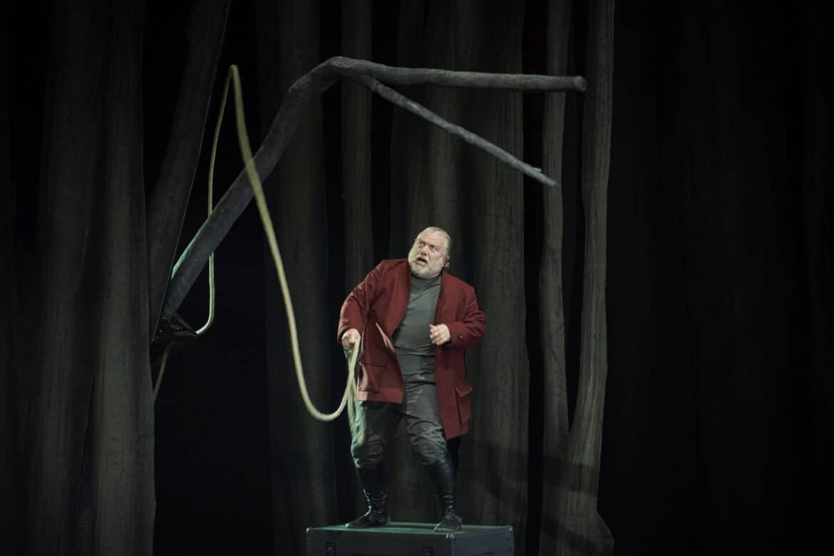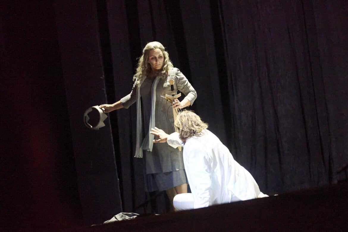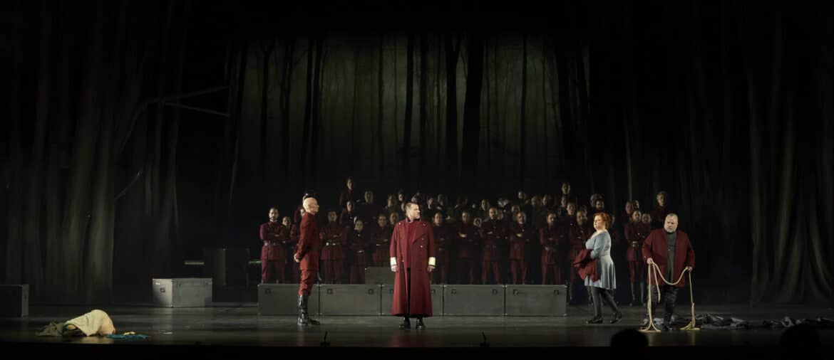Le procès qui suit ne repose plus sur une opposition claire entre le bien et le mal. Le roi Heinrich, d’ordinaire figure de sagesse et d’équilibre, prend ici des allures de dictateur : sa gestuelle est autoritaire, ses hommes d’armes exécutent des ordres avec une discipline rigide, leur démarche quasi militaire évoquant un régime totalitaire dont le nom n’est jamais prononcé. Elsa, quant à elle, est jugée d’avance. Mise à la potence dès le début du procès, elle semble condamnée sans même avoir pu plaider sa cause. Ortrud et Friedrich von Telramund, véritables architectes de sa chute, ont eux-mêmes préparé la corde destinée à son exécution. Dans ce cadre oppressant, le chœur joue un rôle fondamental, se tenant toujours en place avec une précision extrême et offrant une interprétation d’une sensibilité remarquable, donnant ainsi au récit une résonance particulièrement puissante.