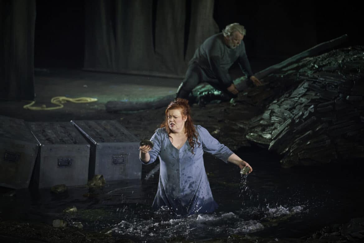 La mare devient ensuite le théâtre d’une scène marquante entre Friedrich von Telramund et sa femme. À la recherche d’une preuve du forfait de Lohengrin, Ortrud, immergée jusqu’au nombril, plonge dans l’eau pour sonder les profondeurs de l’étang. Le cygne noir, omniprésent, semble la guider dans sa quête de vérité. Finalement, Telramund met la main sur la couronne d’enfant enterrée, dévoilant ainsi une preuve accablante qui servira à nourrir leur accusation.