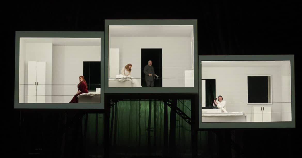 Cette mise en scène renverse totalement l’image traditionnelle du chevalier au cygne. Dès le premier acte, Lohengrin repousse brutalement l’animal d’un coup de pied avant de le dissimuler dans une caisse sous les rires d’une partie du public. Il cherche ainsi à effacer toute trace de ce qu’il est réellement. Ce geste en dit long : le cygne noir incarne à la fois sa conscience et son passé, qu’il tente désespérément de nier. De même, la chaleur habituellement présente dans son duo avec Elsa au troisième acte disparaît totalement. La scène est fragmentée : chacun est isolé dans sa propre chambre, leurs échanges devenant presque fantasmés. Dans un effet de miroir saisissant, le visage de l’enfant noyé surgit, rappel brutal du crime originel. Plus qu’une ombre du passé, il est une accusation permanente, un fardeau dont Lohengrin ne pourra jamais se libérer.