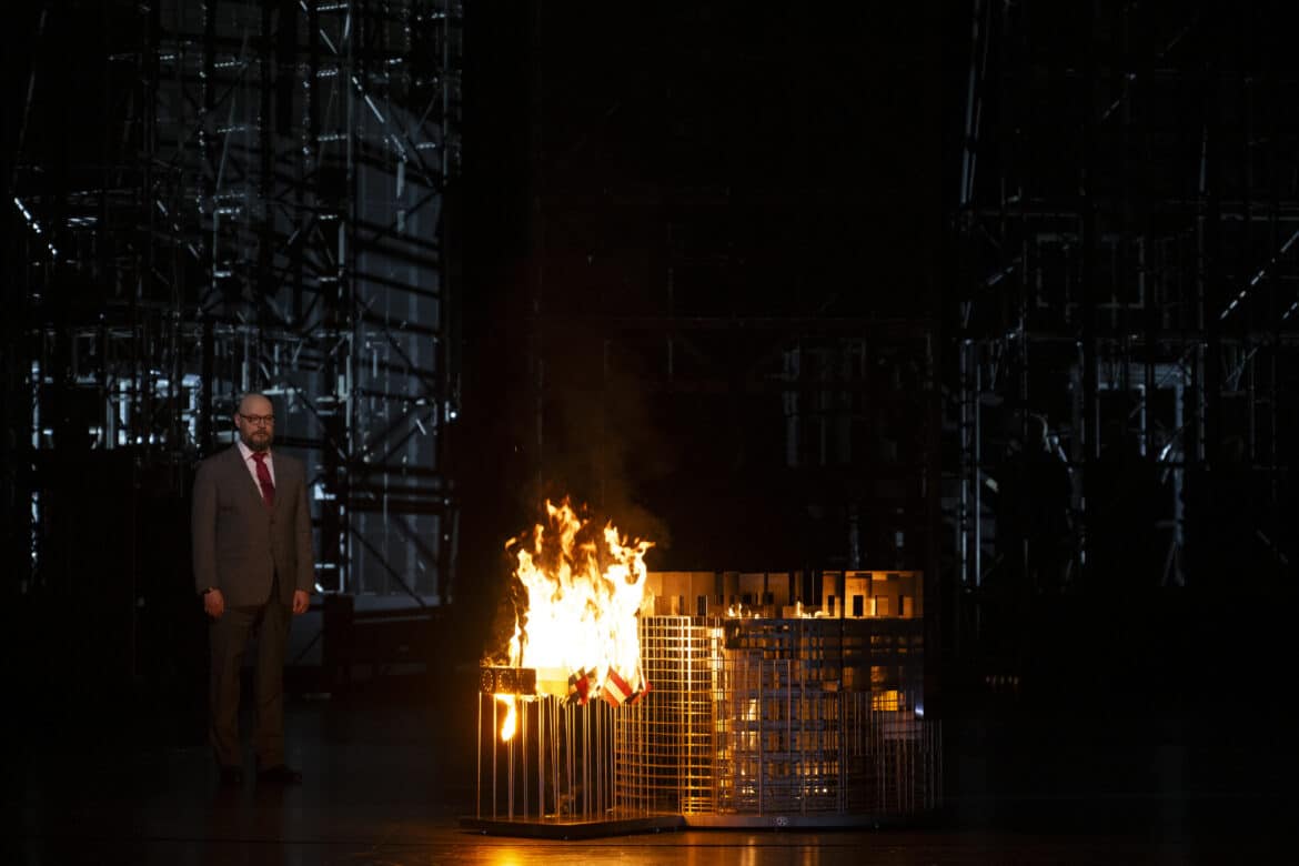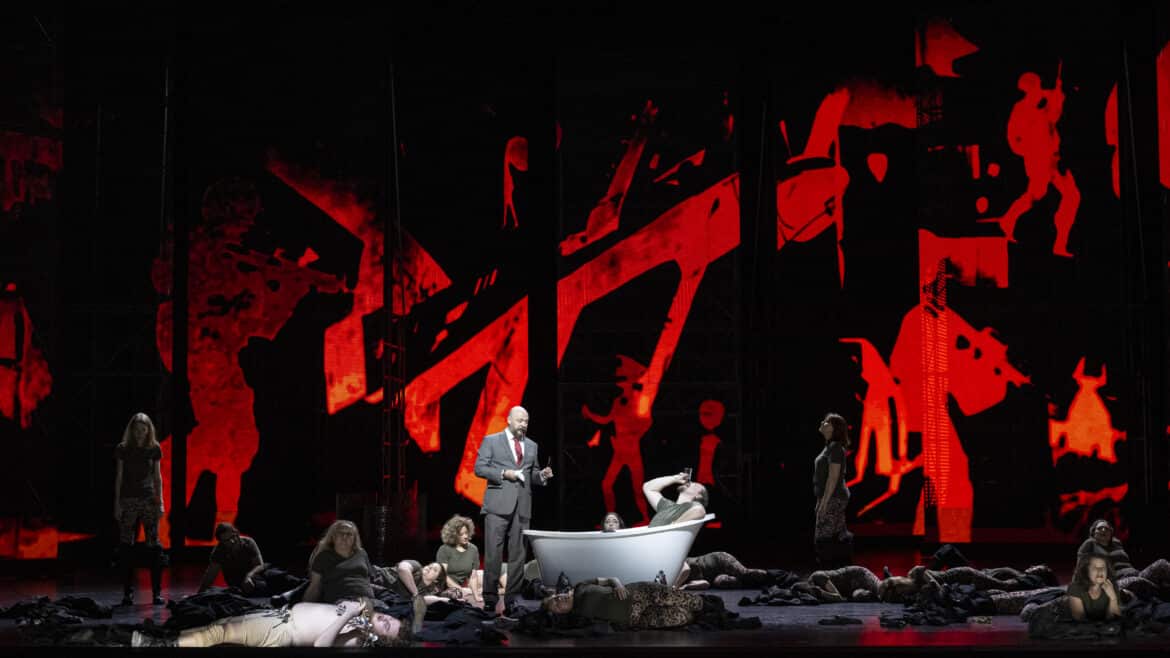Un spectacle accueilli très sagement par le public : aucun cri d’enthousiasme ni de protestation, mais quelques « clap-claps » polis qui montrent peut-être que ces réalisations scéniques, iconoclastes et choquantes il y a trente ans, ont finalement pas mal perdu de leur force au point d’être devenues une nouvelle « norme », plus ou moins attendue, pour ne pas dire convenue… D’autant que Bieito recycle beaucoup, et s’auto-cite bien trop souvent à notre goût : le plateau circulaire au fond duquel se dressent quelques tours en forme d’échafaudages, un personnage agitant sa langue de façon lubrique face au public, l’improbable baignoire dans laquelle on tente de noyer quelqu’un, tout cela se trouvait déjà dans Un ballo in maschera créé à Barcelone il y a quelque… 26 ans !