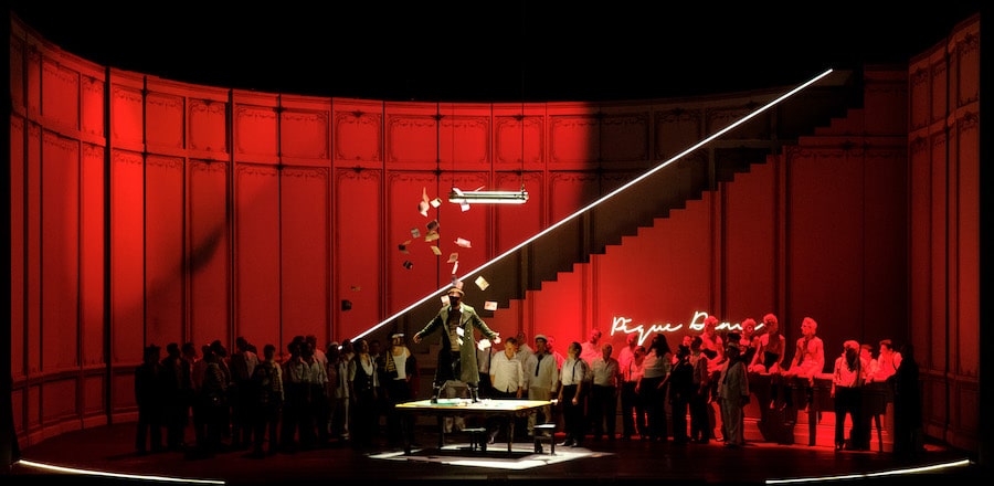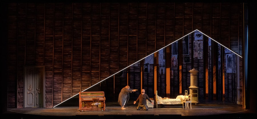 La difficulté pour le chef consiste à donner une unité de sens à une œuvre aussi fragmentée en tableaux très différents. Ici, à la tête de l’orchestre du Regio – en grande forme – se trouve Valentin Uryupin, que nous avions apprécié il y a deux ans dans l’interprétation en version de concert de La Fiancée du Tsar de Nikolaï Rimski-Korsakov, et qui avait également donné une interprétation intense d’une autre œuvre de Tchaïkovski, L’Enchanteresse, à l’opéra de Francfort l’année précédente. Uryupin met en valeur la chaleur des bois et des cordes dans les moments intimes de a partition, l’obsession du protagoniste étant rendue palpable par une musique palpitante et, littéralement, obsédante. Il est d’autant plus regrettable que nous ne puissions entendre ce que le jeune chef ukrainien aurait fait de la « Pastorale ». La page est en effet expurgée dans cette version, certainement par le metteur en scène qui aurait eu du mal à en rendre l’esprit dans son interprétation. La suppression de cette page essentielle dans l’économie de l’opéra, qui se nourrit de cette ambiguïté stylistique mêlant Mozart (tel qu’on le connaissait en 1890, certes), opéra français et thèmes populaires, ne trouve pas selon nous de justification valable.