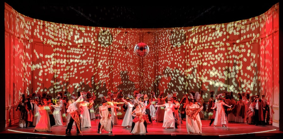 L’une des idées qui sous-tendent la mise en scène est l’engouement de la vieille comtesse pour son agresseur : elle continuera à le suivre post mortem. Une idée irrévérencieuse et intrigante, mais totalement  illogique puisque la femme lui révèle les mauvaises cartes et provoque sa chute. La scène de la comtesse – non pas une vieille femme décrépite, mais une ravissante milf dont les sens sont loin d’être endormis – mourant non pas de peur, mais dans les spasmes du dernier orgasme provoqué par le canon du pistolet que German lui met dans la bouche, restera dans les mémoires comme l’une des plus gênantes vues au théâtre. Presque autant que le bal masqué de l’acte II dans la « grande salle de la maison d’un riche dignitaire » transformée ici en discothèque psychédélique par les lumières se reflétant sur la boule à facettes du plafond. Pour ne rien dire des mouvements érotiques des danseurs dans la chorégraphie de Ron Howell réadaptée par Angelo Smimmo, avec les danseurs strictement regroupés selon différentes combinaisons : lui avec elle, lui avec lui, elle avec elle. Les erreurs de mise en scène sont également évidentes dans cette scène, lorsque les chaises sont d’abord placées en cercle, mais ne sont pas utilisées, puis regroupées à l’arrière pour la « Pastorale », qui n’a cependant pas lieu ! L’éclairage de Linus Fellbom s’avère également malheureux lorsqu’il laisse une partie de la scène dans l’obscurité ou avec de vilaines ombres rasantes, sans parler d’un effet de timing mal pensé au premier tableau, interrompant l’atmosphère ensoleillée du jardin. Le décor choisi par le metteur en scène s’étend sur trois siècles – XVIIIe, XIXe et XXe, et les costumes de Stuart Nunne sont impitoyables envers l’interprète de Lisa, habillée d’abord en ménagère pour la messe du dimanche, puis en princesse Barbie, mais avec les plumes de la Veuve joyeuse sur la tête. Nunne signe également la scénographie, un demi-cercle de panneaux tournants montrant d’un côté une boiserie du XVIIIe siècle et de l’autre les murs tapissés de portraits de Lisa dans la caserne d’Hermann.