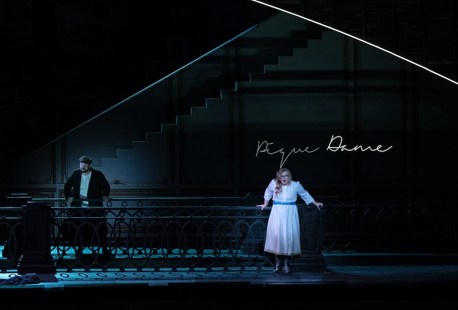 Après les références cinématographiques des trois Manon en début de saison, il manquait un autre film pour accompagner d’images l’histoire de La Dame de Pique ! C’est chose faite avec des images filmiques se présentant comme un commentaire sur le passé de la comtesse ; puis, dans le boudoir de la comtesse qui, telle Norma Desmond dans Sunset Boulevard, se remémore un film dans lequel elle était elle-même une jeune Lisa, défilent des plans du film muet La Dame de Pique réalisé par Jakov Aleksandrovič Protazanov en 1916.