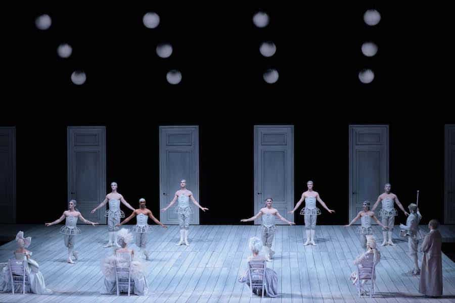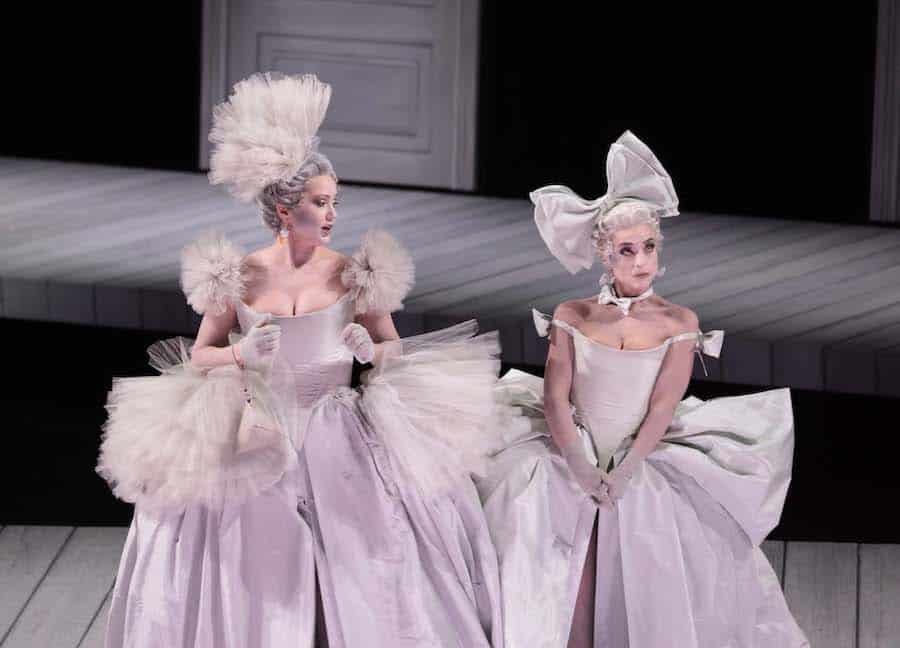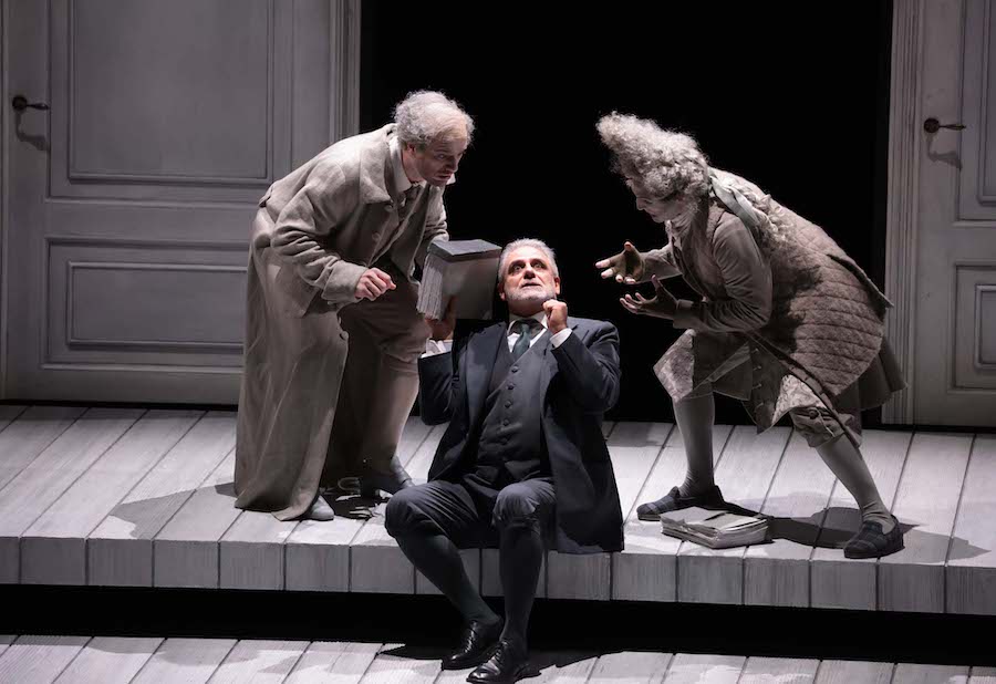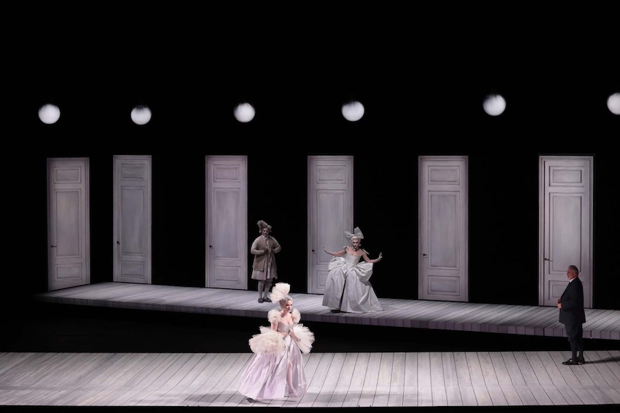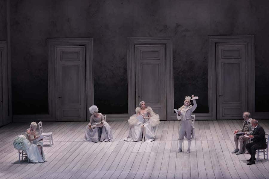Pelly résout la faiblesse de la dramaturgie avec une grande élégance, en s’appuyant sur une mise en scène d’une précision millimétrique et sur une esthétique visuelle extrêmement raffinée rappelant le noir et blanc de certains spectacles de Ponnelle, tant dans les costumes conçus par Pelly lui-même que dans les décors de Massimo Troncanetti éclairés par les lumières de Marco Giusti, apportant des teintes pastel au gris des vêtements. La scène est presque nue dans les deux premiers actes, avec des portes au fond et sur les côtés et huit serviteurs qui se déplacent selon un mécanisme d’une précision absolue pour porter ou enlever les quelques objets nécessaires : une chaise, une table, un instrument de musique, une lance… Des gestes impeccables qui soulignent la personnalité de chaque personnage : l’orgueil de Stonatrilla, la dépression de Smorfiosa, l’arrogance décomplexée de Ritornello, le stress de Delirio – et puis les trois mères, un ténor et deux contre-ténors en travestis hilarants.