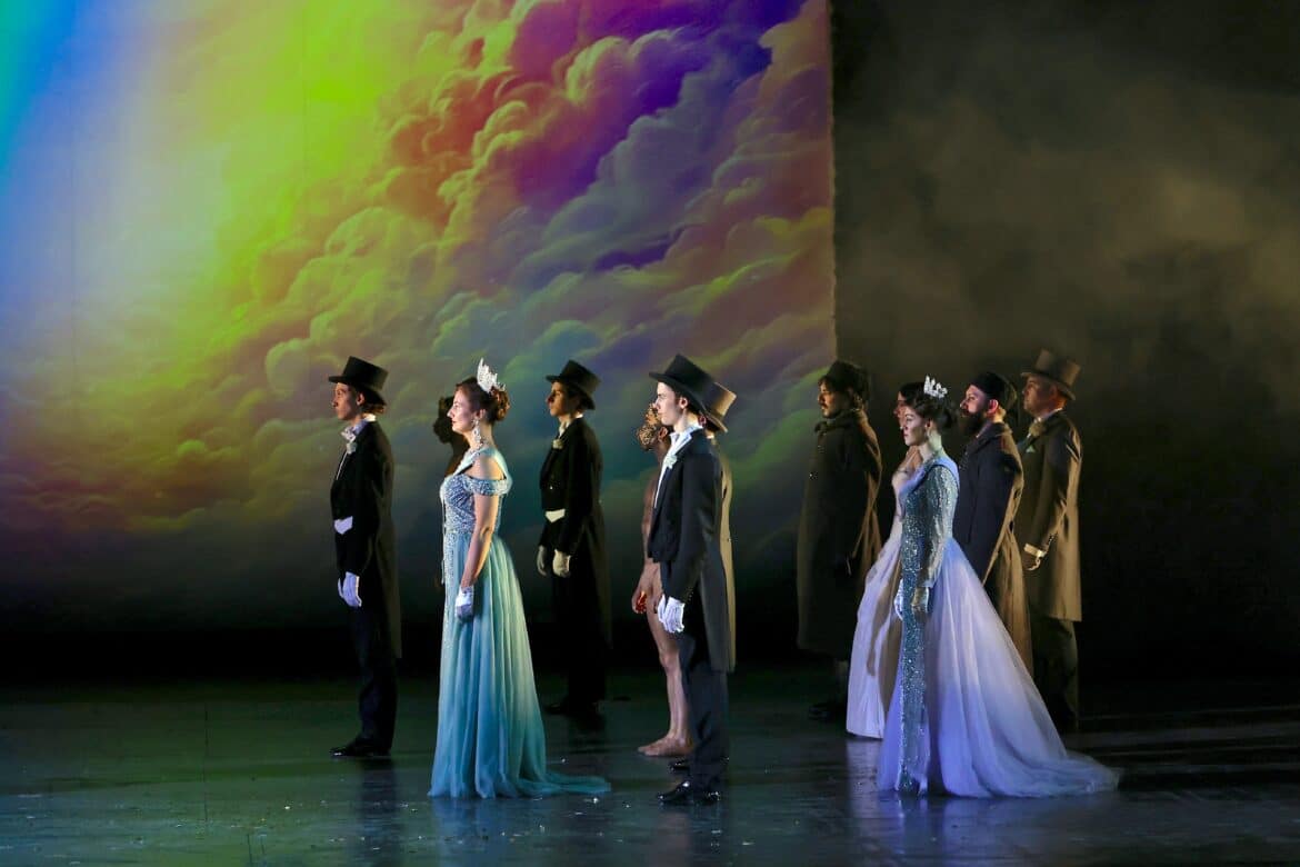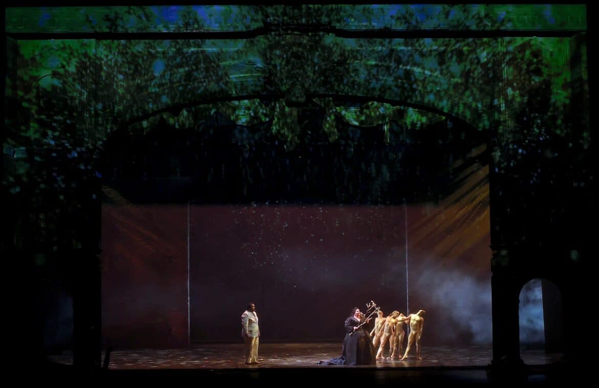 Laurence Dale prend à bras le corps cette incongruité pour en faire le point focal de sa lecture de l’œuvre : dans une mise en abyme du théâtre, les personnages semblent jouer, comme dans un rêve, la fiction de la fin d’un monde. C’est une mise en scène empreinte d’une certaine nostalgie : un cadre de scène délabré, un piano renversé et quelques ruines constituent le décor fixe qui relie ceux des trois actes, qui eux en revanche recréent des décors psychédéliques – pour le premier acte – ou mythologisants – pour les deuxième et troisième acte – confinant au clinquant ou au rococo. Ils suggèrent la fin d’une civilisation qui continue, aveugle, à se rejouer son passé doré, ou le souvenir mélancolique d’un monde désormais en flammes. On pense évidemment au regard d’un Strauss octogénaire, ainsi qu’aux autres artistes cosmopolites de sa génération, comme son ami Stefan Zweig, sur la destruction d’une certaine idée de la culture et de l’Europe, mais aussi aux pratiques théâtrales que l’on perpétuait dans les camps de concentration, parfois pour des raisons propagandistes, comme à Theresienstadt – la paroi en briques nues de la partie latérale du cadre de scène évoquait en effet une construction civile ou militaire, et pas seulement théâtrale.