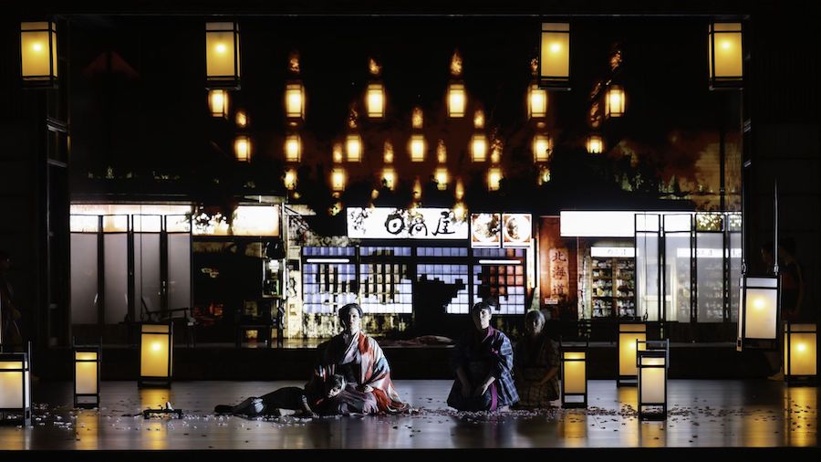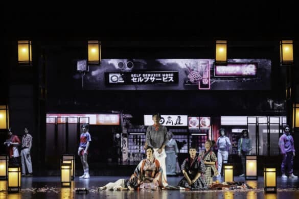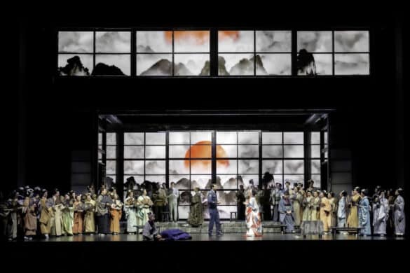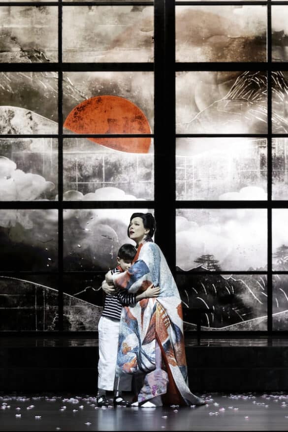 Pour la première fois dans un théâtre allemand, Davide Livermore a conçu une production qui, sans renoncer à sa signature stylistique, est fondamentalement traditionnelle – il y a le Japon, les kimonos, les cerisiers en fleurs… – et linéaire dans sa narration. Elle se déroule cependant en 1978, lorsque le fils de Cio-Cio-San quitte l’Amérique et arrive au Japon pour retrouver ses racines, sa mère et sa liaison d’après-guerre, alors que les États-Unis étaient occupés à aider à la reconstruction du pays vaincu. Il n’a emporté avec lui que les dessins enfantins que l’on voit projetés sur les écrans, et il retrouve ici la vieille Suzuki, interprétée, comme le fils de Butterfly, par des artistes de Butoh. Ensemble, ils revoient les moments passés comme dans un long flash-back, un dispositif qui ne gêne en rien le plaisir de l’histoire, mais qui ajoute un élément d’émotion supplémentaire. Livermore ne renonce pas à la contribution des vidéos D-Wok avec des images de Nagasaki, des arbres en fleurs, des ciels nuageux, le cercle rouge du soleil, des montagnes plongées dans la brume, tandis que Giò Forma crée une scénographie simple mais efficace : une structure qui tourne ou se rétracte à l’arrière-plan, la maison qui, au troisième acte, devient une cage-prison pour le papillon Cio-Cio-San que nous voyons comme dans un théâtre d’ombres chinoises.