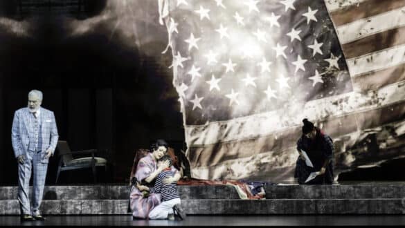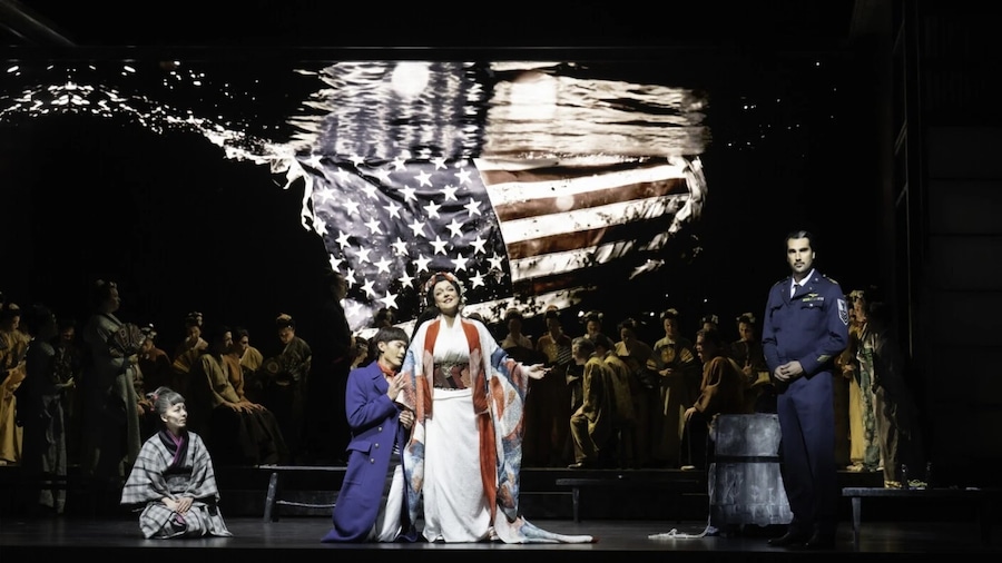 La mise en scène de Livermore comporte même un tour de passe-passe, beau et fulgurant quand, comme dans les spectacles de Brachetti, la robe de Butterfly se transforme en un instant derrière le drapeau à étoiles et à rayures qui tombe d’en haut. C’est le moment du déshabillage pour la première nuit d’amour, une scène résolue avec beaucoup d’élégance par le metteur en scène qui place un alter ego de Cio-Cio-San dans les bras de Pinkerton, préservant ainsi la pureté de l’amour de l’ex-geisha. Le drapeau que l’on voit flotter en lambeaux dans l’eau dans les vidéos du finale devient le linceul de la femme sacrifiée.