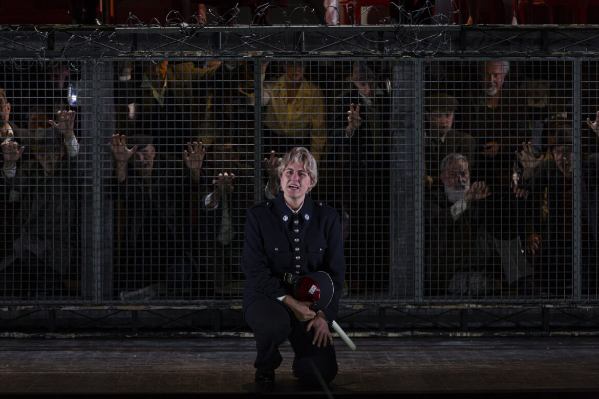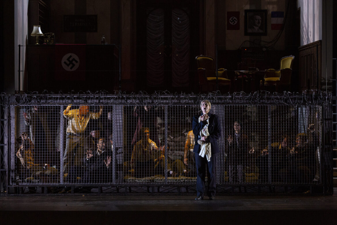 A l’Opéra de Bordeaux, pour célébrer la liberté, cette nouvelle production de Fidelio ouvre les portes de l’inclusion. En confiant la mise en scène à Valentina Carrasco, une des pionnières de La Fura dels Baus, le directeur de l’Opéra (Emmanuel Hondré[1]) réitère son choix opéré pour La Favorite de Donizetti (2023). Cette fois, le projet participatif avec des résidents de l’Agglo bordelaise va plus loin, tout en questionnant notre brûlante actualité sur le milieu carcéral. La metteuse en scène intègre en effet une douzaine de personnes placées sous main de justice, comme figurants autour du Chœur des prisonniers (2e tableau du 1er acte, finale du 2e acte). De plus, en transposant le récit de Fidelio sous l’Occupation, elle interroge les pratiques de l’arbitraire sous un Etat dit de droit.  En conséquence, ces figurants interprètent qui les résistants(es) détenus(es), qui les nazis de la Gestapo, qui la police du régime de Vichy, avec un indéniable engagement qui tourne le dos à leur situation précaire.