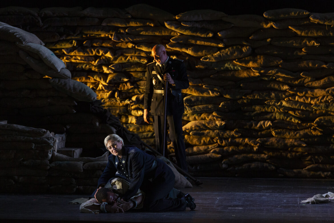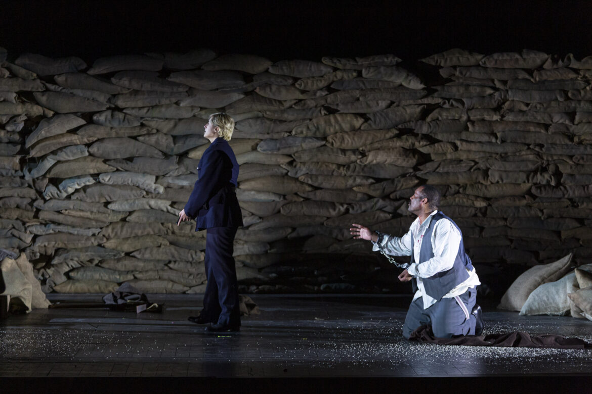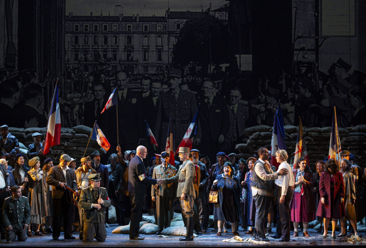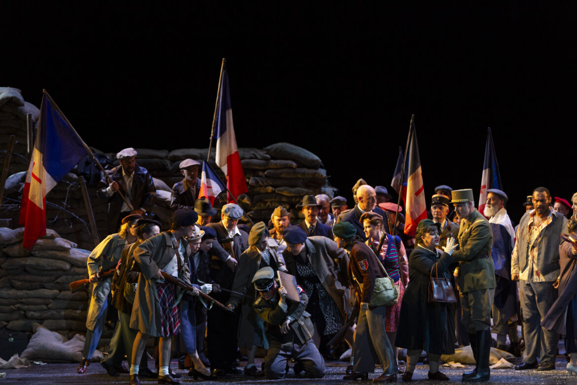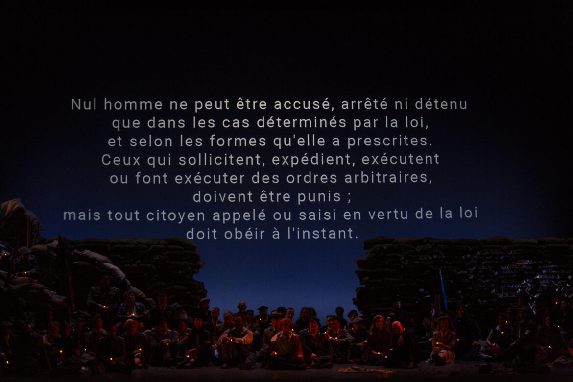 A contrario, au second acte, l’ouverture du plateau scénique s’opère graduellement, de la pénombre aux Lumières, de la clôture des sacs de jute cernant la cellule de Florestan jusqu’à la brèche guerrière (et politique) des résistants. Conduits par Don Fernando (silhouette et képi du Général), ils éventrent la tranchée afin de délivrer le prisonnier Florestan. Drapeaux tricolores à la Delacroix (La Liberté guidant le peuple), ce tableau animé du finale enfante le fraternel finale beethovénien dans une synergie collective et citoyenne. Cette lecture s’inscrit donc dans le droit fil d’appropriations politiques qui offrent un message d’urgence pour les publics d’opéra.