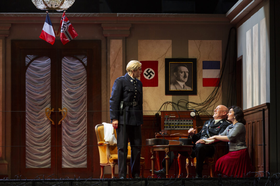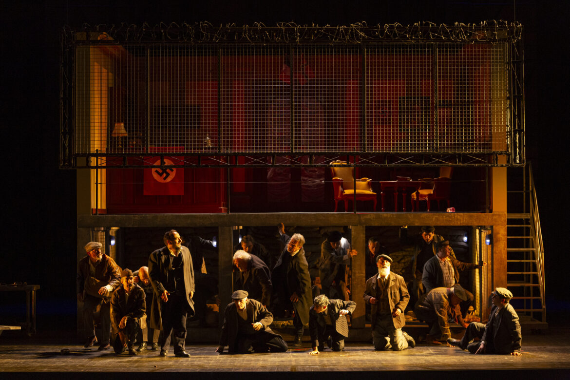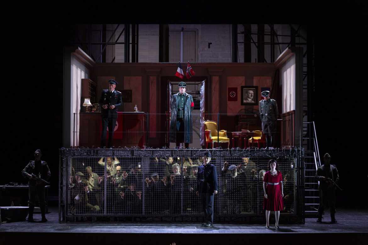 Cette appropriation fonctionne à plein régime, d’autant que les photos d’archives bordelaises contextualisent les lieux et présences historiques[2], telle celle de Papon ou de la venue du général de Gaulle, etc.  Référencés à Lucie Aubrac faisant évader son époux (Raymond le résistant)[3], les héros Léonore et Florestan se dressent face à Pizzaro, le gouverneur tyrannique de la prison d’Etat (un Klaus Barbie lyonnais). Les pratiques tortionnaires hantent les recoins de scène, tolérées par la compromission du geôlier Rocco et de sa fille, par ailleurs adeptes du marché noir. Participant à la crédibilité, la scénographie de Carles Berga mise sur l’enfermement oppressant au premier acte (plutôt que l’intrigue intime du Singspiel) par un dispositif à deux niveaux. Celui-ci superpose les cachots souterrains – des cages grillagées contraignant les détenus à s’accroupir – sous l’hôtel bordelais (en hauteur) réquisitionné par la Gestapo, croix gammée et portrait du Führer placardés. Sur ce plateau exigu officient le geôlier Rocco et sa fille Marcelline, pactisant soit avec le jeune gardien Fidelio, soit avec le redoutable gouverneur Pizzaro. Seul moment d’apaisement, la levée des grilles figure la sortie temporaire (et le premier Chœur) des prisonniers, associée à l’inondation d’une chaude lumière (Antonio Castro). Celle-ci magnifie les corps de femmes et d’hommes renaissant à la vie : mouvements, frôlements.