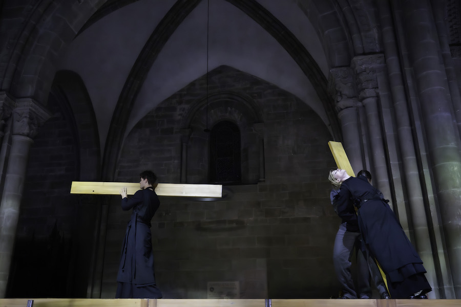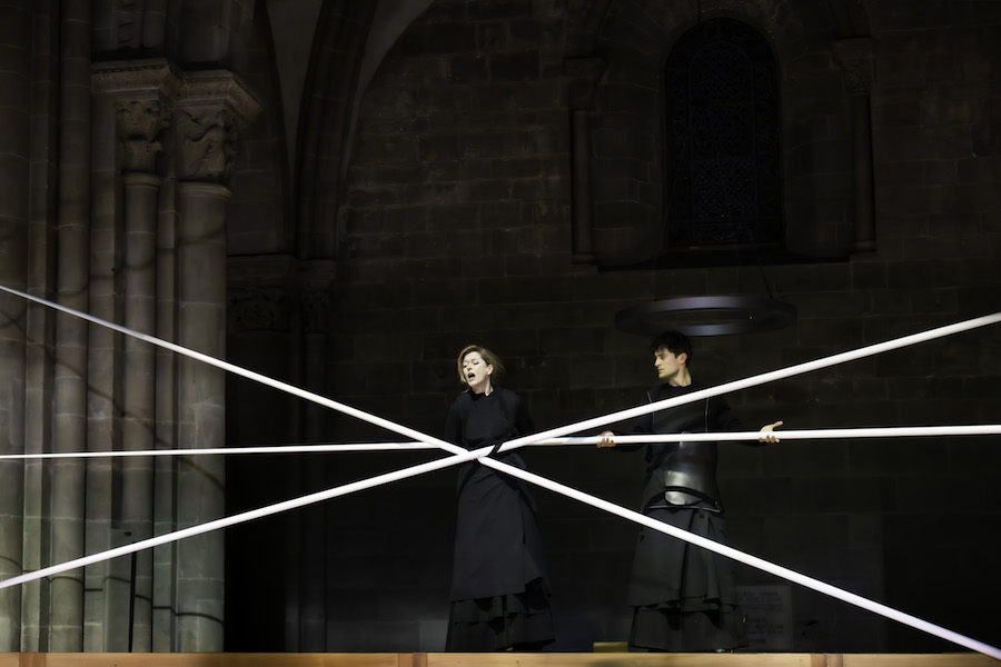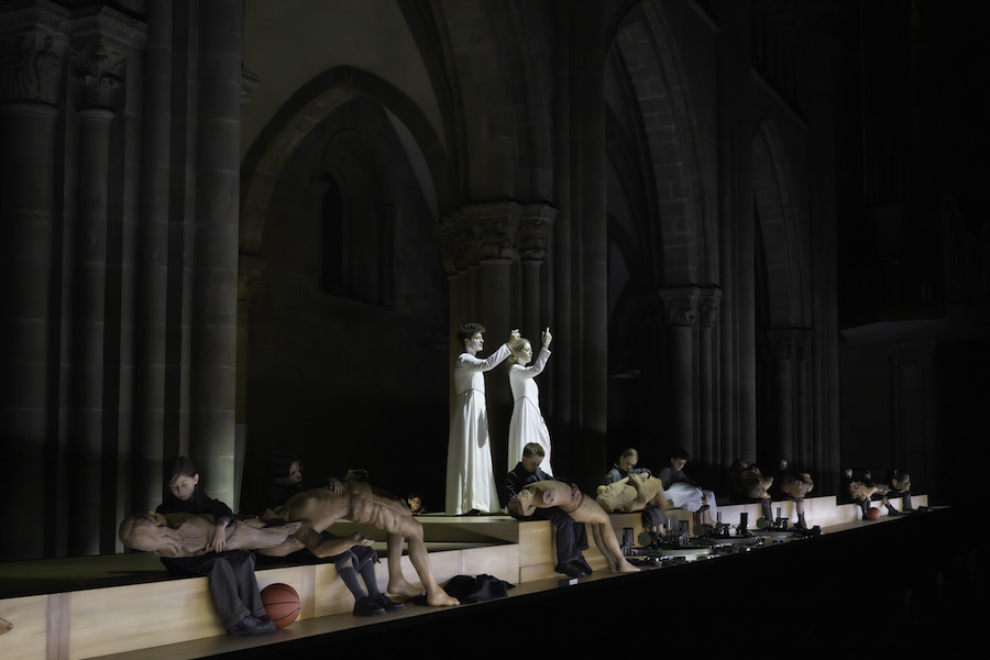 L’éclairage diffus met en valeur le drame qui va se dérouler. Des femmes et des hommes vêtus de gris arrivent et forment des groupes compacts qui « donnent naissance » d’abord à une petite fille, puis à la figure masculine de saint Jean et enfin à la figure féminine de Marie. Pendant la représentation, les interprètes et les personnages sont disposés en tableaux vivants rappelant les figures des pleureuses médiévales ou baroques tandis que la musique de Pergolèse, interprétée par l’ensemble Pomo d’Oro, quintette à cordes et orgue cachés à la vue des spectateurs, se greffe sur celle de Scelsi avec une continuité surprenante. Les tempi sont dilatés, tenant compte de la réverbération acoustique, et les voix de Barbara Hannigan et Jakub Józef Orliński sonnent comme celles de pleureuses émergeant d’un deuil collectif. L’interprétation de la soprano est dramatique, presque viscérale et extrêmement contrastée, tandis que la ligne vocale du contre-ténor est plus sobre, mais caractérisée par une grande projection et une intense présence sur scène. Dans leurs différentes approches interprétatives, les deux chanteurs atteignent des niveaux dramatiques et émotionnels très élevés. Visuellement, le spectacle culmine avec l’arrivée d’une quinzaine d’enfants – et après le concert d’hier soir, on ne peut s’empêcher de penser aux enfants du camp de  Terezín dans leurs petites robes grises… – qui reçoivent sur leurs genoux des représentations du corps supplicié du Christ. Un mélange déchirant d’innocence et de mort.