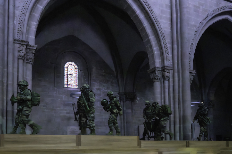 La première impression en entrant dans l’austère temple de la Réforme calviniste[i] est déconcertante tant par la perspective que par le dispositif symbolique mis en place dans l’église : les bancs sont alignés le long de la nef et orientés vers le sud sur une très longue estrade en bois clair sur laquelle se déroule la cérémonie. Car c’est bien de cela qu’il s’agit : le théâtre rituel de Castellucci trouve ici sa forme la plus significative, celle d’un rite quasi liturgique qui n’exige pas d’applaudissements, mais une participation intense des spectateurs, et où signes religieux et picturaux s’entremêlent dans un espace d’une grande intensité émotionnelle. Les quelques lumières sont focalisées sur une inquiétante procession de soldats en tenue de camouflage, casques et lunettes noires, armés d’instruments de musique, également peints en gris-vert, qui vont s’installer dans le chœur : ce sont les musiciens de l’Ensemble Contrechamps – dix-huit instrumentistes à vent, trois percussionnistes et cinq cordes basses – qui entonnent, en prélude à la musique de Pergolèse, les Quatre pièces pour orchestre de Giacinto Scelsi, compositeur ligure (1905-1988), premier adepte en Italie du dodécaphonisme d’Arnold Schönberg. Scelsi a également anticipé des courants de la musique contemporaine comme la musique minimale et la musique spectrale, et avec les Quattro pezzi su una nota sola, écrites en 1959 et originellement pour orchestre de chambre, il a voulu rendre perceptible la vibration et la profondeur du son, sa consistance plutôt que l’art combinatoire des notes, qui ne sont ici qu’une pour chaque pièce, vivant des moindres variations dynamiques, de la couleur et de la densité renforcées par la réverbération de l’environnement. Il s’agit d’une ouverture de l’espace dans la première pièce, d’un appel dans la deuxième, d’une attente et d’une recherche dans la troisième, et d’une vision infernale à travers un amas assourdissant dans la quatrième. Sous la direction de Barbara Hannigan, également méconnaissable sous sa tenue de camouflage, un empâtement matériel monochrome et spectral est créé sur lequel trois très longs poteaux blancs montés sur des bases motorisées se déplacent dans un ballet abstrait, se balançant dans la nef de la cathédrale comme des faisceaux de lumière laser.