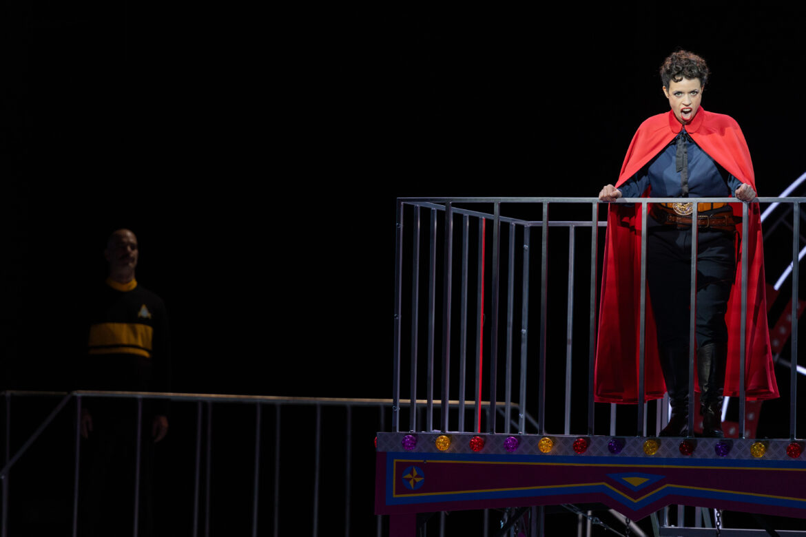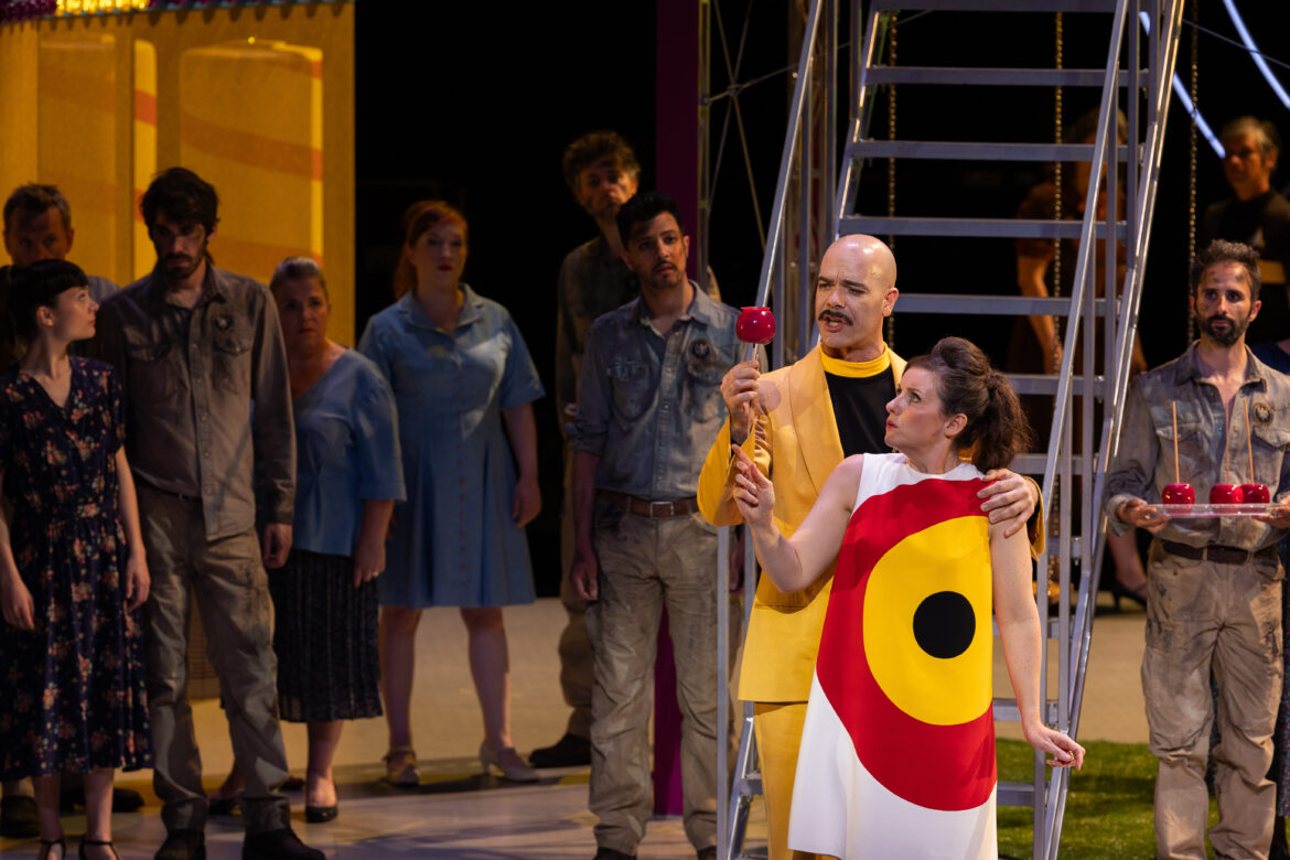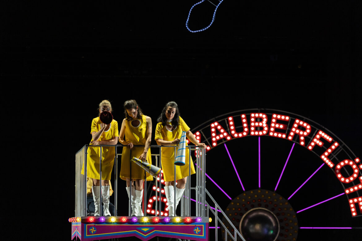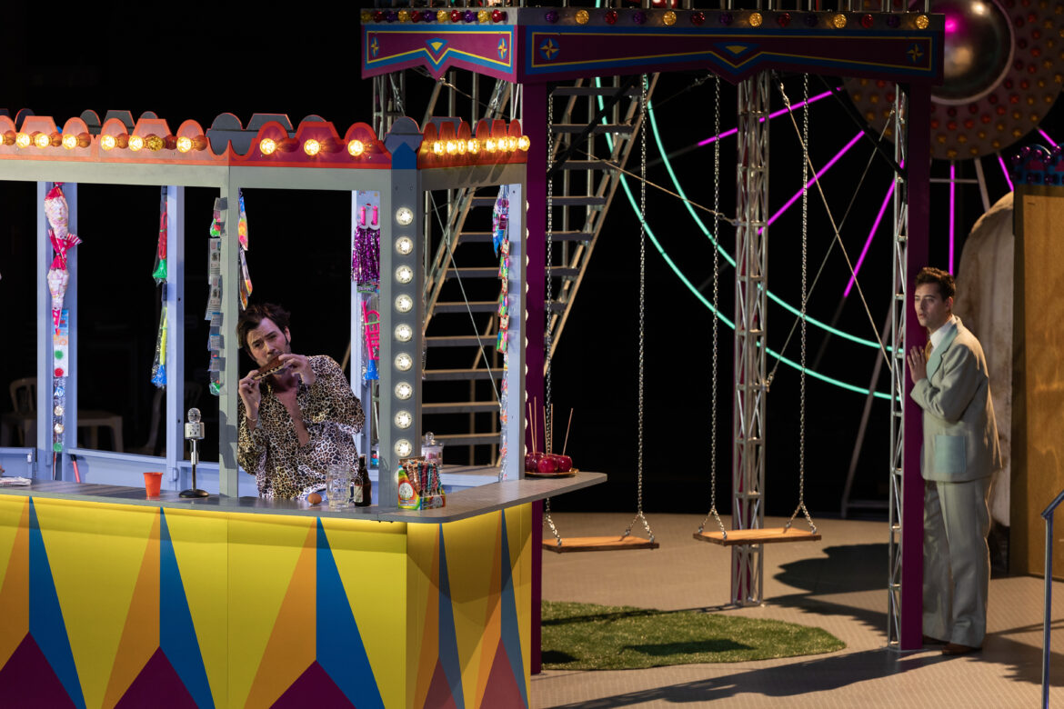 Or le premier mérite de la mise en scène de Mathieu Bauer (déjà applaudi à Angers, Nantes et Rennes en 2022 pour un Rake’s progress très apprécié par Première Loge) est précisément d’avoir su mettre l’œuvre à la portée de tous les publics, y compris les enfants : en inscrivant l’intrigue dans le cadre d’une fête foraine (la Zauberflöte est le nom d’un manège dont Sarastro, sorte de Monsieur Loyal, est le directeur), il propose une soirée vive, drôle, colorée, rythmée. Le spectacle se veut séduisant et pédagogique : le metteur en scène renonce ainsi fort heureusement à toute relecture plus ou moins absconse et favorise la lisibilité du propos et le charme des images. Mathieu Bauer ne se contente pas pour autant d’une plate illustration littérale du livret mais intègre à la représentation quelques gags, trouvailles et effets visuels fort bienvenus, pimentant le déroulé du spectacle sans rien lui ôter de sa fraîcheur. Une remarque cependant. Les (très) longs dialogues parlés de Schikaneder ont été conservés, et dans leur langue originale : c’est tant mieux, l’alternance entre deux langues (l’originale pour le chant, le français pour les dialogues) sonne souvent artificielle et rompt la continuité dramatique et poétique de l’œuvre. Plusieurs théâtres ont cependant récemment choisi de conserver les dialogues originaux en les abrégeant, de façon à ne conserver que les éléments nécessaires à la compréhension de l’intrigue. C’est une option qui aurait pu, nous semble-t-il, être retenue ici, de façon à ne pas lasser un public pas nécessairement germanophone – et tout particulièrement, précisément, les enfants.