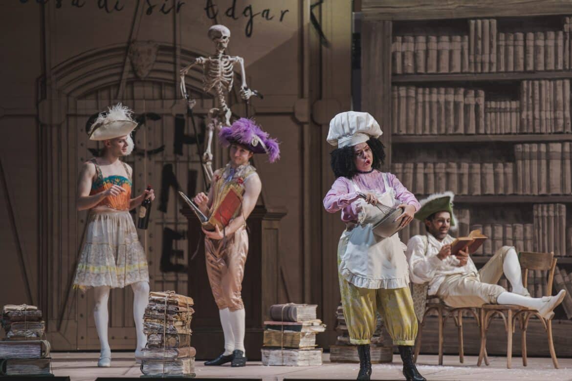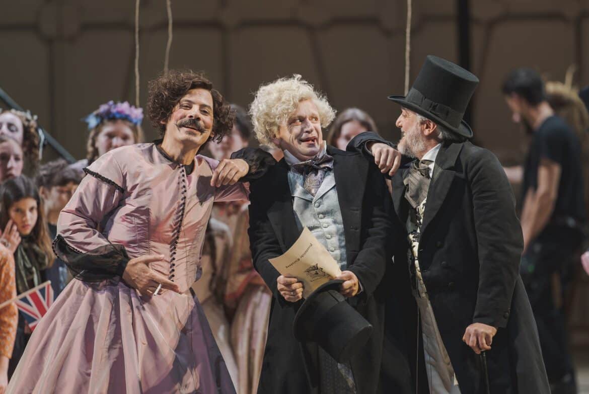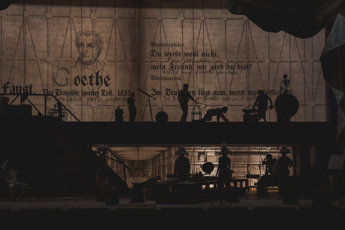 Il est rare de voir un spectacle aussi soigneusement construit où, malgré la complexité, l’interaction entre la scène et la fosse est constante et où tout fonctionne du début à la fin, pour le plus grand plaisir des spectateurs. Les décors de Davide Signorini sont relativement simples : l’accent est mis avant tout, comme on devrait toujours le faire, sur le talent de ceux qui chantent et jouent ; en dépit de leur simplicité, les décors ne manquent cependant pas d’originalité. C’est ici que Menghini et Signorini choisissent d’ajouter une pincée de style toscan aux indications scéniques de Henze et Bachmann, qui placent l’action dans une petite ville on ne peut plus allemande : cet opéra est une grande caricature, et donc les décors ainsi que deux personnages silencieux qui se déplacent sur la scène évoquent le journal satirique Il lampione, fondé en 1848 par Carlo Lorenzini alias Collodi (l’auteur de Pinocchio) et les caricatures du XIXe siècle.