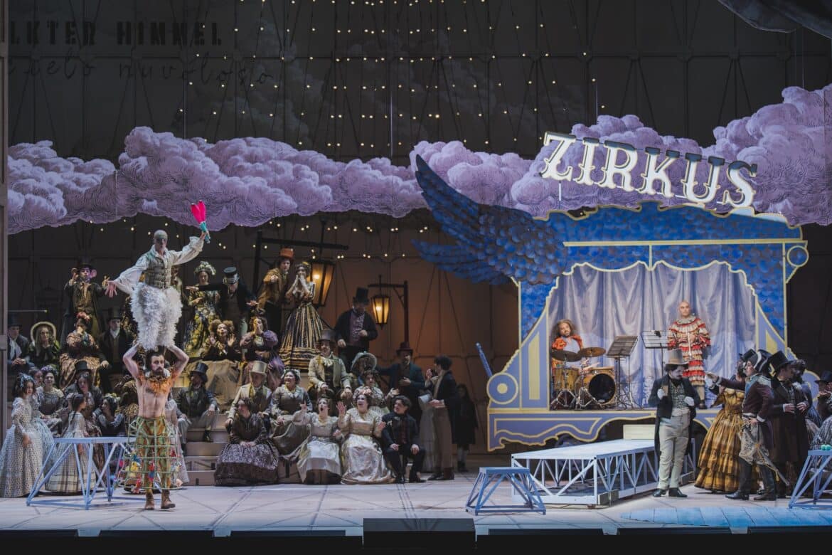 Étant donné la rareté de ce titre, il n’est pas inutile de résumer brièvement l’intrigue de Der Junge Lord (Le jeune Lord) : vers 1830, un riche Anglais, Sir Edgar (le seul personnage sur scène qui joue sans chanter ni parler, poussant à l’extrême les coutumes du Singspiel allemand), va s’installer dans une grande maison située dans une ville de province allemande, très attendu par des notables locaux cupides et vaniteux. Son arrivée, avec un entourage d’animaux et de serviteurs exotiques, déconcerte les provinciaux ; le refus de toute invitation mondaine, transmis par l’intermédiaire d’un secrétaire bizarre et éloquent (l’excellent baryton Levent Bakirci), est pris comme une offense et la mauvaise humeur se répand, qui va exploser lorsqu’un cirque arrive, à la grande joie du peuple : la représentation est interrompue et les circassiens sont chassés par les notables. Sir Edgar intervient, invitant tout le cirque chez lui. Peu de temps après, des cris étranges proviennent de l’intérieur (émis par le ténor Matteo Falcier, bon interprète de cette partie difficile de l’œuvre) que le secrétaire, devant les citoyens alarmés, expliquera comme l’expression de la déception de Lord Barrat, le jeune neveu de Sir Edgar qui vient d’arriver, pour les méthodes un peu sévères d’enseignement de la difficile langue allemande. Une invitation à une fête lorsque le jeune Lord aura terminé ses études réconcilie les classes supérieures avec Sir Edgar ; la hautaine et vaniteuse baronne Grünwiesel (une Marina Comparato très amusée par son rôle) rêve d’avoir enfin trouvé un parti digne de sa nièce Louise (la soprano Marily Santoro), qui jusque-là avait confié à son amie Ida (la soprano d’agilité Nikoletta Hertsak) ses tendres sentiments pour l’étudiant Wilhelm (le ténor Antonio Mandrillo).