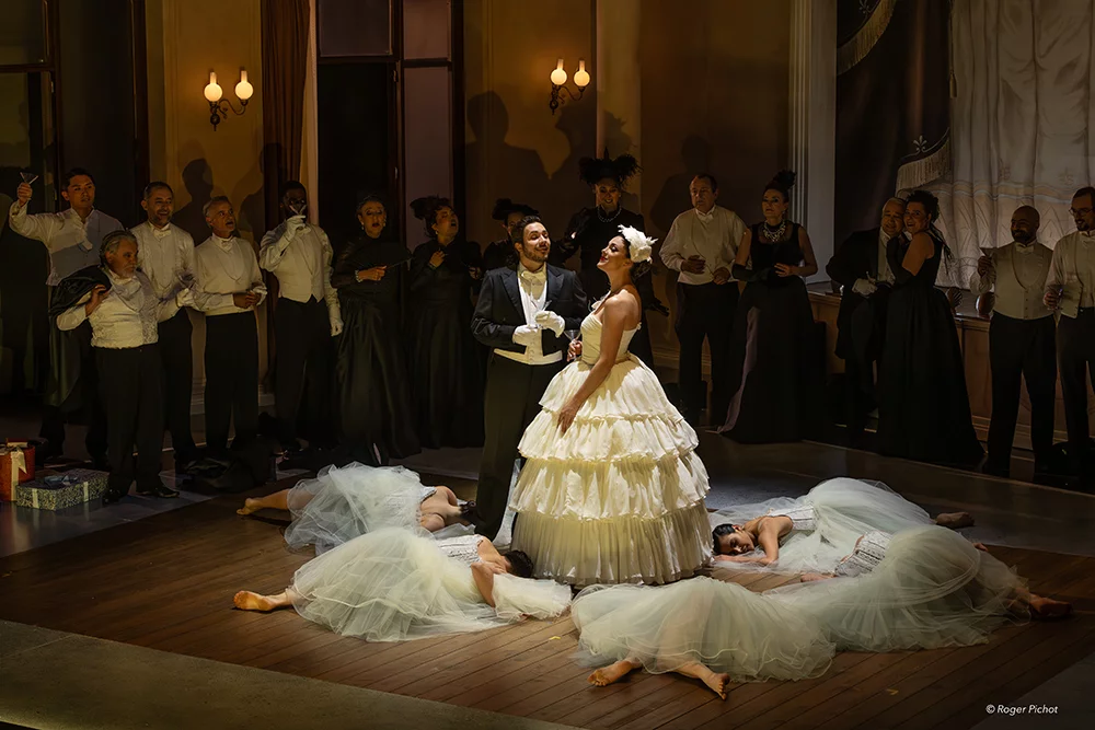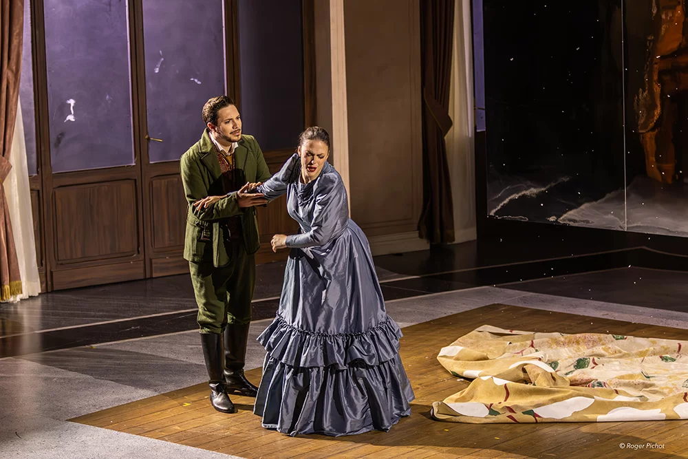 Si la lecture de Silvia Paoli – par ailleurs riche en images fortes, du solo de danse accompagnant le prélude du premier acte au subtil fondu orchestrant le passage de la fête carnavalesque de l’acte II à la chambre désolée de l’acte III – manque quelque peu de nuances, elles ne font heureusement défaut ni aux solistes vocaux ni à l’orchestre. Pour sa prise de rôle, le jeune Léo Vermot-Desroches (acclamé en 2024 dans le Domino noir à l’Athénée et les Contes d’Hoffmann à Salzbourg, où il remplaçait Benjamin Bernheim) investit avec une théâtralité très affirmée le personnage d’Alfredo. Préservant le rôle d’Alfredo de toute mièvrerie (il nous tarde de l’entendre en Don Ottavio !), son timbre plein et charnu sonne avec fougue dans le finale de l’acte II, mais le ténor fait aussi montre d’un phrasé vibrant d’émotion dans un « Lunge da lei… » qui lui vaut l’ovation de la salle. Le baryton québecois Jean-François Lapointe retrouve un Giorgio Germont maintes fois abordé sur les scènes européennes et américaines – la dernière fois à Toulouse, voilà deux ans. On reste saisi par la force de projection de son instrument, pour lequel le volume intimiste du Grand Théâtre de Tours semblerait presque inadapté. Et pourtant, quelle poésie dans son grand duo de l’acte II avec Alfredo, où scintille un « Di Provenza il mar il sole… » à tirer les larmes. Il retrouve ici une Violetta Valéry à qui il donnait la réplique en 2019 à l’Opéra-Garnier en la personne de Zuzana Marková, grande triomphatrice de cette soirée. La soprano tchèque aborde à Tours sa quinzième production de la Traviata et livre au public une masterclass d’interprétation habitée. En mondaine reine des fêtes du Second Empire, en amoureuse fragile puis en recluse agonisante, elle aborde les métamorphoses de son personnage avec la même justesse théâtrale, qui se double d’une ductilité vocale que ne vient troubler aucun vibrato excessif, du bel canto emporté de « Follie, Follie ! » au declamato ouvrant l’acte III. Et chacun dans le public de retenir son souffle en l’écoutant faire ses adieux au passé.