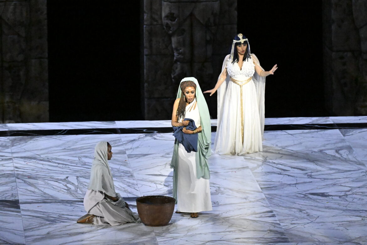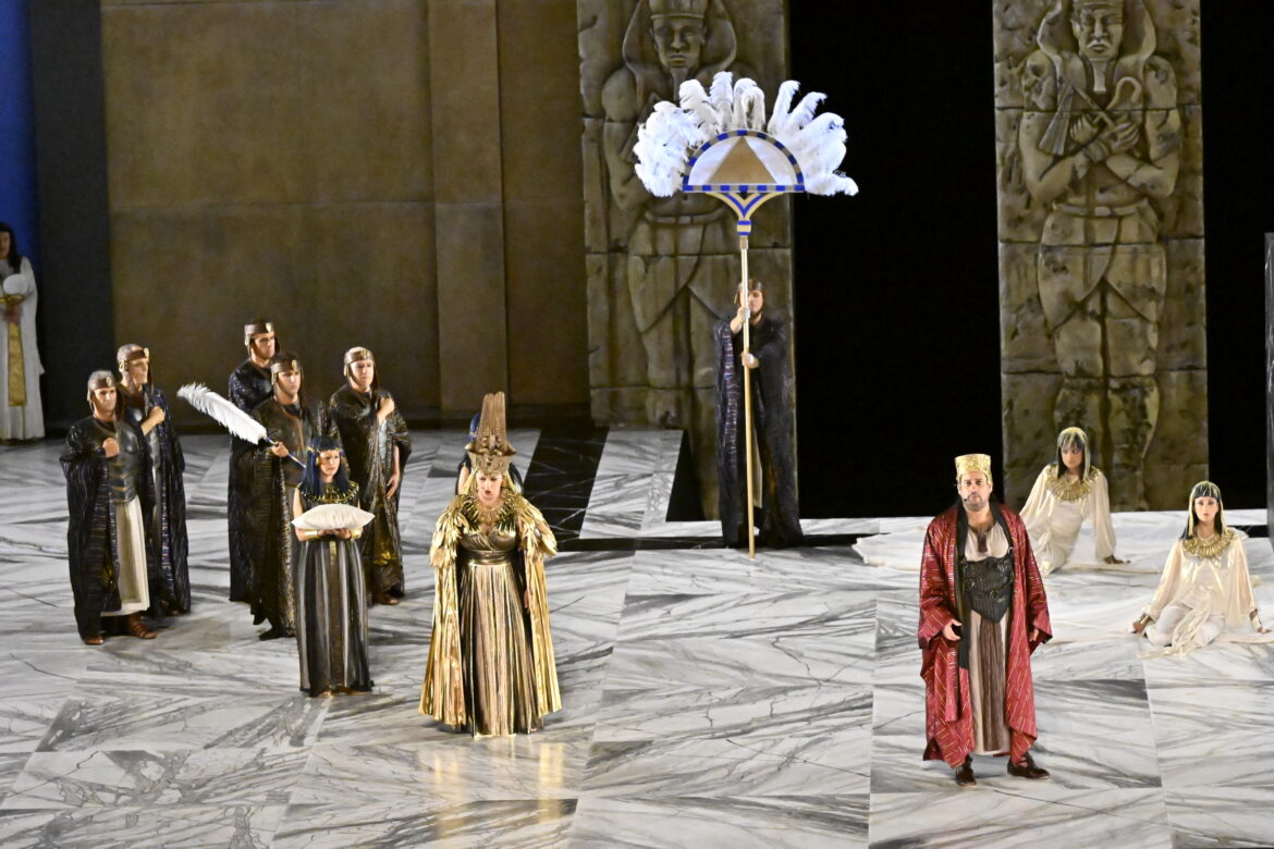 Les costumes enfin, somptueusement conçus par Giovanna Fiorentini dans le goût de la superproduction hollywoodienne Cléopâtre avec Liz Taylor, rendent parfaitement lisible le drame et permettent aisément, à distance, de reconnaître Amneris à sa somptueuse robe de faille d’or ou l’esclave Aïda à sa modeste tunique blanche ourlée d’un voile bleu. Dans cette esthétique à l’ancienne, le maquillage d’Amonasro reste discret mais certains s’étonneront sans doute de trouver encore une black face sur une scène d’opéra en France en 2025…