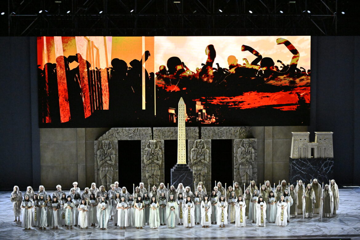 Pour autant qu’on puisse en juger, le clarinettiste qui accompagnait l’introduction de l’air du Nil, au début du IIIe acte, a la virtuosité nécessaire pour convoquer la nostalgie dont Aïda est submergée à ce moment du drame et le chef, Paolo Arrivabeni, est à son affaire avec l’énorme mécanique qu’est devenu l’orchestre verdien dans les ultimes compositions du Maestro. Ses choix de tempo sont cohérents, les grandes scènes de foule qui nécessitent le tutti de l’orchestre et des choristes s’appuient sur la colonne vertébrale d’une direction pointilleuse mais le volume tonitruant de la sonorisation engloutit dans son magma toute tentative de subtilité – ce dont souffre surtout la mort des héros qui requiert habituellement un art consommé des pianissimi diaphanes.
