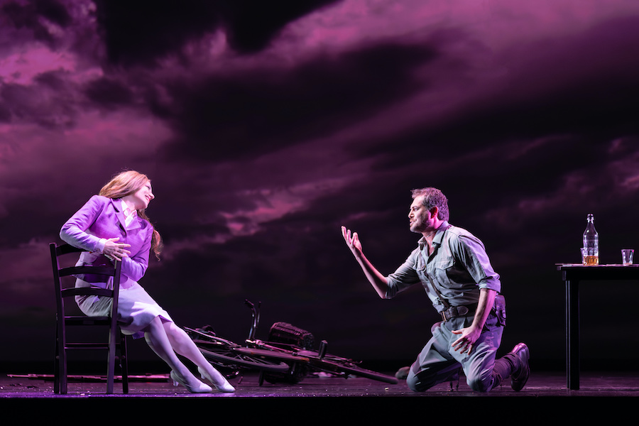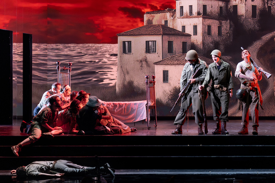 La modernité de l’œuvre est exaltée par le metteur en scène Davide Livermore, qui situe l’histoire mythologique sur une île méditerranéenne après la Seconde Guerre mondiale, « une Ithaque suspendue dans l’après-guerre, imprégnée de l’odeur de la mer et de la mémoire d’un monde ancien. Une réalité livide et poussiéreuse qui semble tout droit sortie du cinéma néoréaliste de Rossellini et Visconti », écrit Livermore dans ses notes de mise en scène. Et c’est bien à Stromboli ou à La terra trema, mais aussi à Mediterraneo de Salvatores, que l’on pense en voyant les décors d’Eleonora Peronetti et les costumes d’Anna Verde, qui construisent un monde où « le temps devient une attente rythmée par le ressac de la mer et du vent et marque la répétition des gestes, le lent écoulement de la vie quotidienne » et où « l’île est l’écrin géographique de souvenirs méditerranéens ». Les lumières d’Antonio Castro et surtout les projections de D-WOK, si justes et essentielles dans ce spectacle, fournissent le support visuel pour définir un espace de terre en attente d’un avenir que l’on espère meilleur.