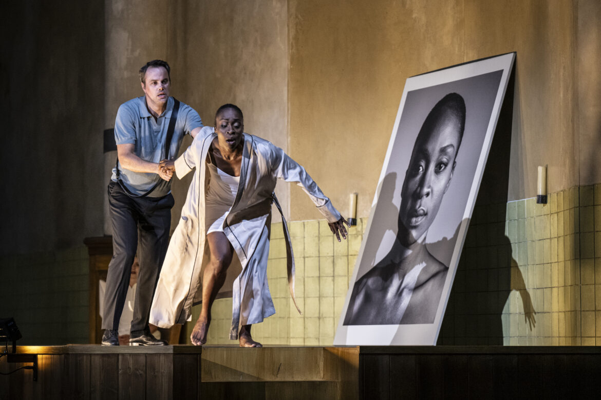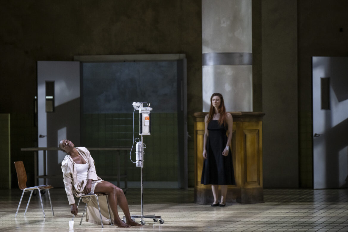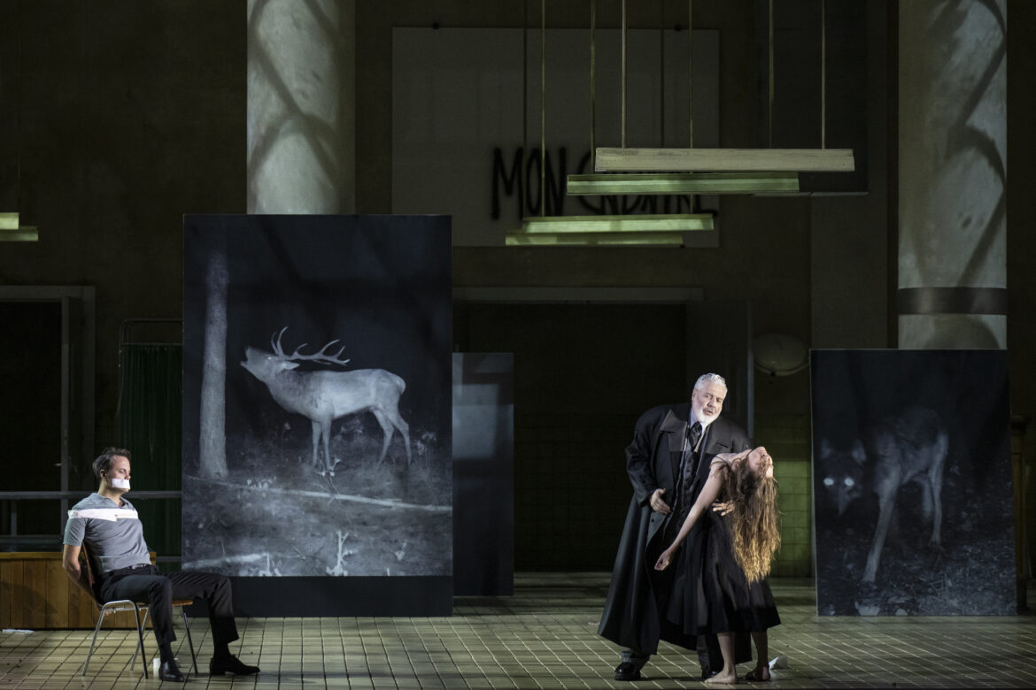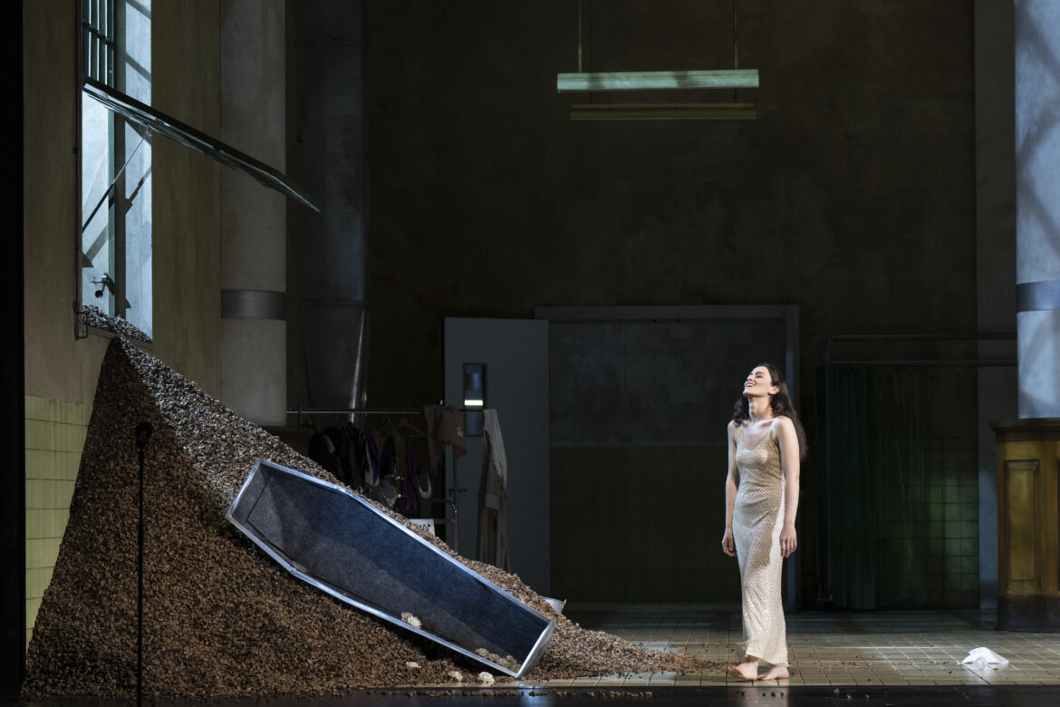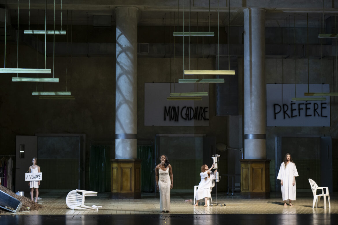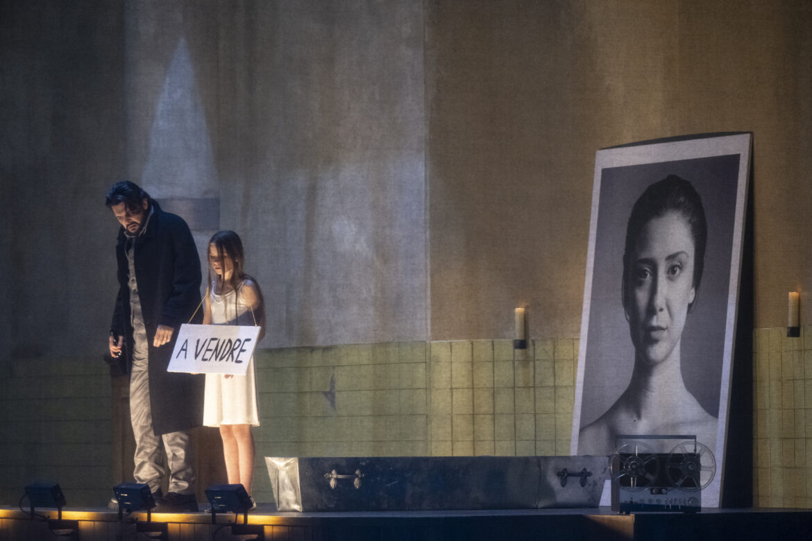 Le rideau se lève ainsi sur une grande salle années 1930 qui pourrait être à la fois un hall d’hôpital ou le foyer d’un théâtre où des draps blancs déclinent le slogan « Mon cadavre préféré ». Ce décor unique (Aleksandar Denić) restera inchangé pendant toute la représentation. Entre alors Giorgio Germont, tenant par la main une fillette (Violetta 4 ?) qu’il maquille et qu’il met aussitôt en vente en lui accrochant au cou une pancarte : « à vendre ». Elle sera vite achetée par un homme d’âge mûr. Proxénète, le rôle du père s’affirme d’emblée comme celui d’un accroc à la bouteille et, plus tard, comme le tenancier d’un tripot de Paris. Jusque-là nous sommes dans le domaine des transpositions d’une certaine forme de Regietheater, ou de ce qui s’en inspire, comme nous en avons vu à foison depuis des décennies. La véritable innovation de la metteure en scène réside, en revanche, dans l’imposition d’un charcutage systématique de la partition. Qu’à cela ne tienne…