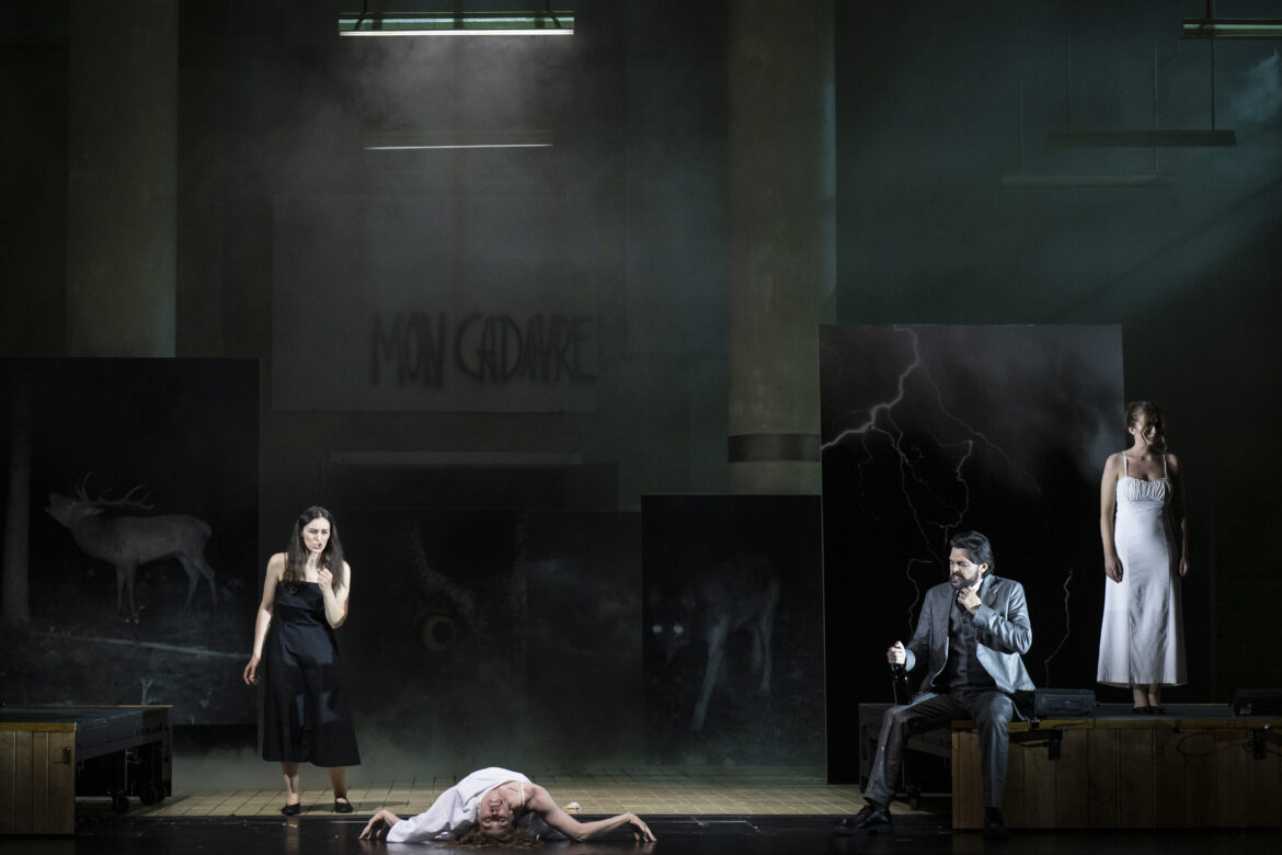 Pas de prélude à l’acte III, déjà entendu, mais Violetta 4 qui fredonne le « Libiamo », pendant que l’on dépose le cercueil, avant de lire la lettre d’Alfredo dans sa traduction en français… un clin d’œil à la source ? L’air de Violetta est privé de sa deuxième strophe, puisque nous l’avons déjà entendue au début, et l’écho du Carnaval est remplacé par une reprise du brindisi. Le dernier duo entre Violetta 1 et son bien-aimé atteint un degré de sensualité inespéré dans une telle accumulation d’incohérences. Sans doute parce que, enfin, on la laisse chanter sans interruption. L’interprète atteint ainsi un niveau tragique singulier. Violetta 3 est en sang, alors que les notes conclusives laissent à nouveau la place à quelques accords du prélude de l’acte III.