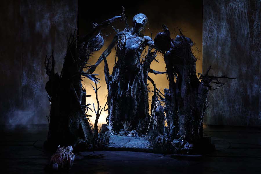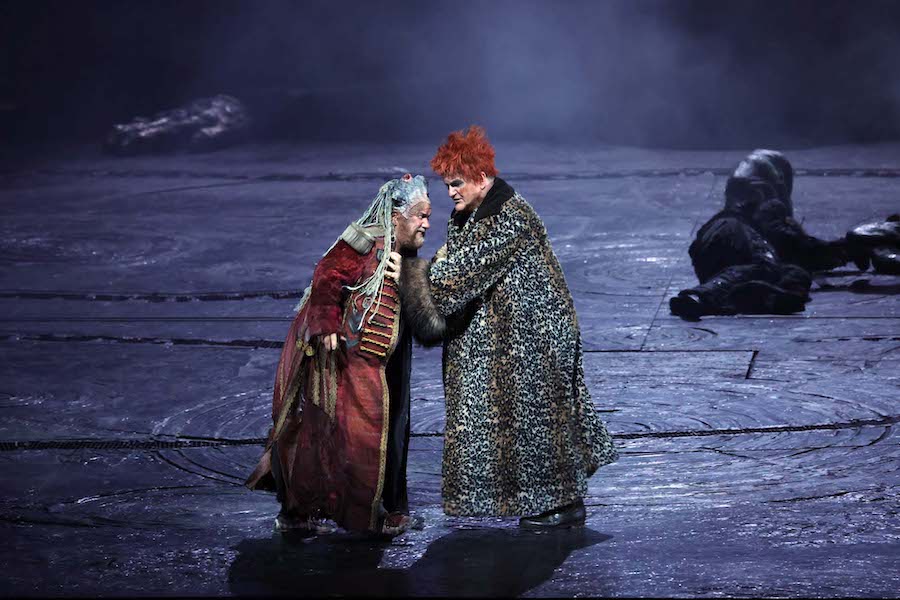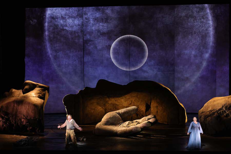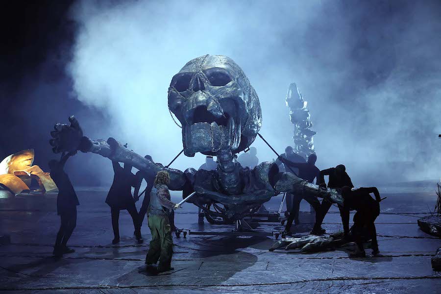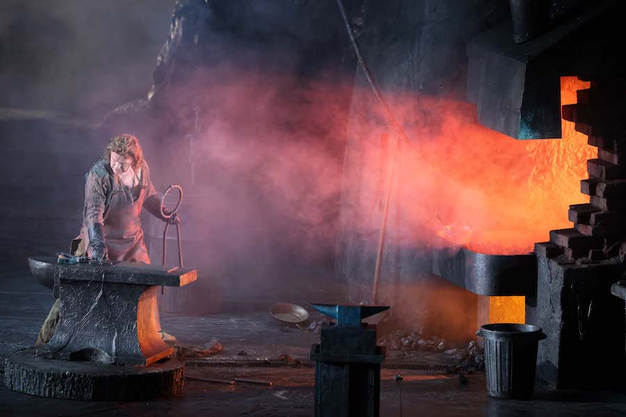 « Pour résoudre les problèmes posés par Wagner, une approche littérale n’est certainement pas le meilleur choix : si l’on s’en tient aux indications scéniques telles qu’elles sont écrites, on perd le cœur symbolique de tout ce qui se passe ». En lisant ces phrases sur le programme, on serait bien en peine de reconnaître Sir David McVicar comme leur auteur, car le metteur en scène écossais propose justement une lecture littérale, didactique et surtout rassurante, qui passe visuellement de tons réalistes (Acte I) à la fantaisie (Acte II) et à un vague symbolisme (Acte III). C’est le choix très légitime de renoncer à toute lecture idéologique et de se limiter aux éléments féeriques de l’histoire – oiseaux parlants, dragons, belle au bois dormant réveillée par le baiser du prince charmant… – sans poser de problèmes et surtout sans avoir honte de les représenter pour ce qu’ils sont. Voici donc le logis de Mime, dans une caverne où cuisine et forge sont placées côte à côte, de sorte que pendant que Siegfried martèle sur l’enclume, le nain vide la soupe empoisonnée dans une gourde avec sa louche après que le héros lui a donné un énorme ours, apporté par deux figurants. Huit serviront à manœuvrer le dragon Fafner, un squelette rampant qui, au moment de sa mort, redevient le géant que nous avions vu dans le Prologue, mais sans échasses, tandis que le cheval de Brünnhilde du premier jour réapparaît également, se réveillant en même temps que sa maîtresse et représenté ici par un jeune homme torse nu sur des prothèses élastiques. La représentation de l’oiseau parlant est magnifiquement résolue : il s’agit un autre jeune homme torse nu, avec une longue perche au bout de laquelle volette un oiseau, tandis qu’un chanteur avec une crête de punk fait bouger un oiseau sautillant sur le sol. Il faut saluer l’habileté de McVicar qui n’hésite pas à obtenir une solution avec des moyens très artisanaux mais expressément théâtraux. La technologie est laissée aux projections vidéo de Katy Tucker, simples et fonctionnelles, qui représentent des ciels orageux, des flammes, des planètes en conjonction, l’œil enflammé du dragon entouré d’un anneau projeté sur le rideau noir qui descend entre les actes. Les décors d’Hannah Postlethwaite et de McVicar lui-même distinguent les différents environnements : celui, trop réaliste, de la grotte, mais fonctionnel pour les gags de l’interprète de Mime ; celui, romantico-horrifique, de l’entrée de la grotte de Fafner avec les trois silhouettes humaines décharnées ; le lieu sauvage de la première partie de l’acte III, un espace vide avec une sphère derrière laquelle Erda dort, réveillée par Wotan/Wanderer ; le rocher au profil féminin (vu dans Die Walküre) et la main sur laquelle repose Brünnhilde endormie (tirée de Das Rheingold) de la longue scène finale. Les costumes d’Emma Kingsbury sont élaborés et évocateurs à juste titre, jouant sur des couleurs sombres et neutres, à l’exception des vêtements féminins de Mime (le manteau de fourrure imprimé léopard…) qui souligne l’ambiguïté du personnage de l’uniforme de cirque rouge et or d’Alberich, le souverain déchu avec la couronne en carton, et de la tunique bleue de Brünnhilde.