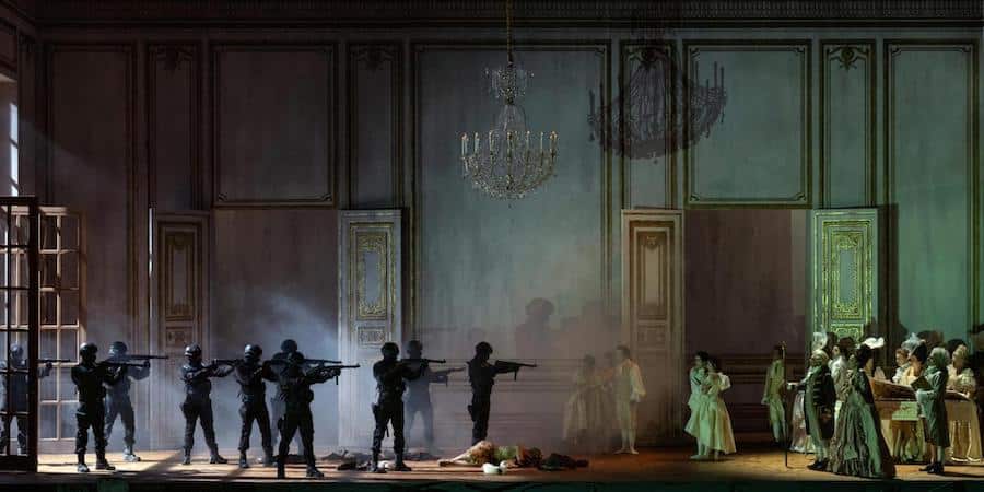 « Cela dura trois mois ! | Ah non… trois siècles ! », déclare Elvira à Arturo dans I puritani. Le metteur en scène Giancarlo del Monaco pense la même chose de son Andrea Chénier, à l’affiche du Teatro Regio de Turin en cette fin de saison. Dans sa mise en scène, entre le premier et le deuxième tableaux, plusieurs siècles se sont en effet écoulés et, du XVIIIe siècle un peu gâteux des aristocrates oisifs de la Révolution française, on passe au Paris de la Terreur, un monde où règnent la suspicion et la violence, mais qui devient ici une dictature du XXe siècle. On pouvait  s’en douter dès le début du spectacle : devant un rideau semi-transparent, le serviteur Gérard, celui qui a lu Jean Jacques Rousseau et les Encyclopédistes, profère son mépris à l’égard des « seigneurs arrogants » entre deux tas de débris dans lesquels apparaissent des pneus de voiture et d’autres objets peu compatibles avec le Siècle des Lumières. Dans le finale du premier tableau, la « noble gavotte » est interrompue par des parachutistes armés de kalachnikovs, et dans le second tableau, nous voyons des nobles en perruque et en crinoline se diriger vers la potence, tandis que le décor à l’entour nous plonge dans une atmosphère grise du XXe siècle.