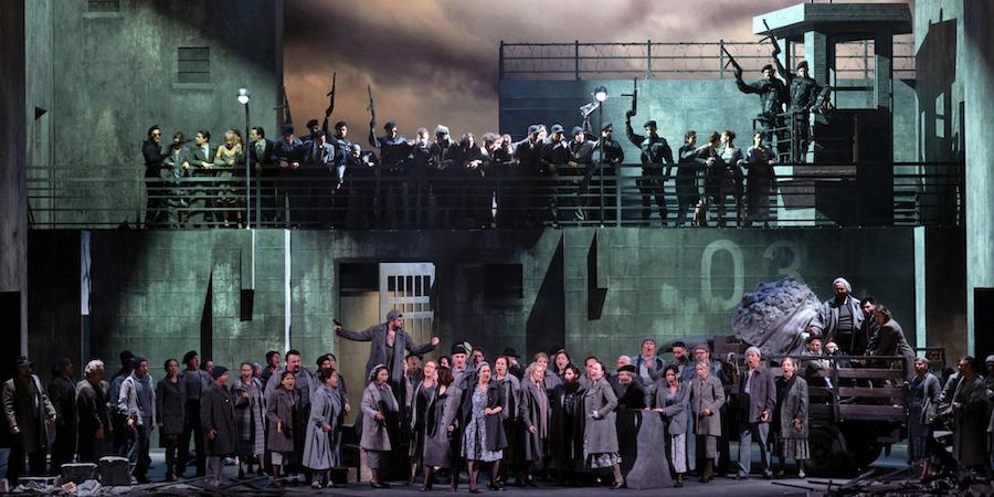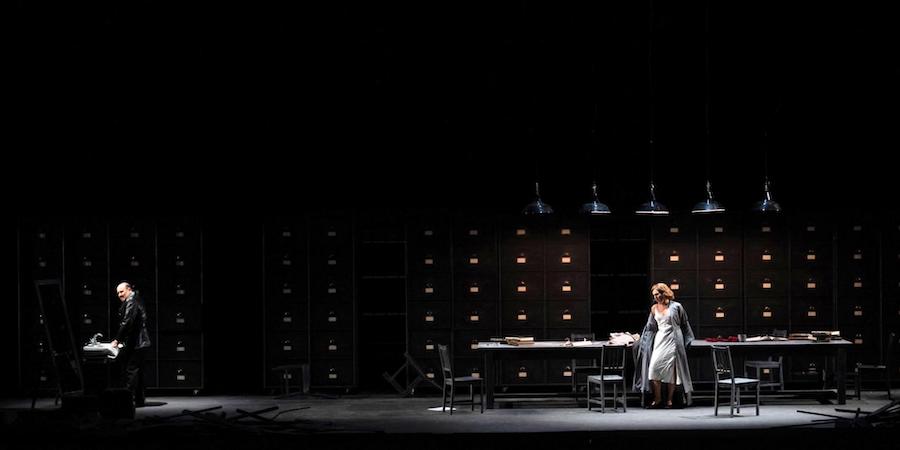 Le metteur en scène compare le poète Chénier à Julian Assange de WikiLeaks, porteur de vérités. Cette grille de lecture n’est cependant pas totalement convaincante, et le choix de situer Illica et l’œuvre de Giordano à des époques éloignées de plusieurs siècles alors que des références précises dans le livret renvoient à des personnages du XVIIIe siècle – Robespierre, les sans-culottes, la guillotine…. – alors que sur scène apparaissent des camions, des barbelés, des archives de la Gestapo, ne sert guère l’unique chef-d’œuvre de Giordano (Fedora et Siberia demeurant nettement moins populaires qu’Andrea Chénier). Le metteur en scène et fils du légendaire ténor abandonne un instant la veine descriptive et linéaire de tant de ses productions pour s’aventurer dans une vision dystopique portée par les décors désolés de Daniel Bianco. Après avoir donné à voir les élégantes boiseries du château de Cloigny, il nous propose l’extérieur d’un pénitencier avec ses hauts murs, ses barbelés et ses miradors, puis à l’intérieur d’un commissariat de police aux classeurs volumineux, et enfin au camp de concentration (avec barbelés et miradors ) où a lieu le sacrifice des deux amants unis par la mort. Les costumes de Jesus Ruiz et les éclairages de Vladi Spigarolo sont cohérents avec le choix de la mise en scène qui oppose le XVIIIe siècle frivole au XXe siècle sombre et menaçant, les événements historiques au triangle amoureux des trois personnages principaux, les tensions révolutionnaires à l’effondrement des espoirs et des déceptions. La Révolution française est « le début de tout : de la Révolution russe, de la Révolution chinoise, du nazisme, du fascisme… Une révolution est une utopie et les utopies ne fonctionnent jamais, elles se rebellent contre le désir humain d’un monde meilleur », écrit le réalisateur.