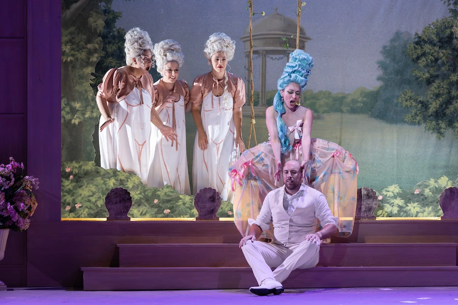 Les personnages qui font tout pour ne pas être considérés comme secondaires – et qui y parviennent ! – sont le Licco du contre-ténor turinois Danilo Pastore, ici une élégante dame des années 1930 en travesti, et le Page de Maximiliano Danta, le contre-ténor uruguayen qui s’est distingué au dernier Concours Cesti. Ce sont deux chanteurs à suivre de près pour leur personnalité. Les Trois Grâces Benedetta Zanotto, Giorgia Sorichetti et Isabella Di Pietro complètent cette distribution typique des œuvres de Cavalli. Souvent présent et vivant, le chœur du festival apporte sa précieuse contribution au dénouement triomphal de la soirée.