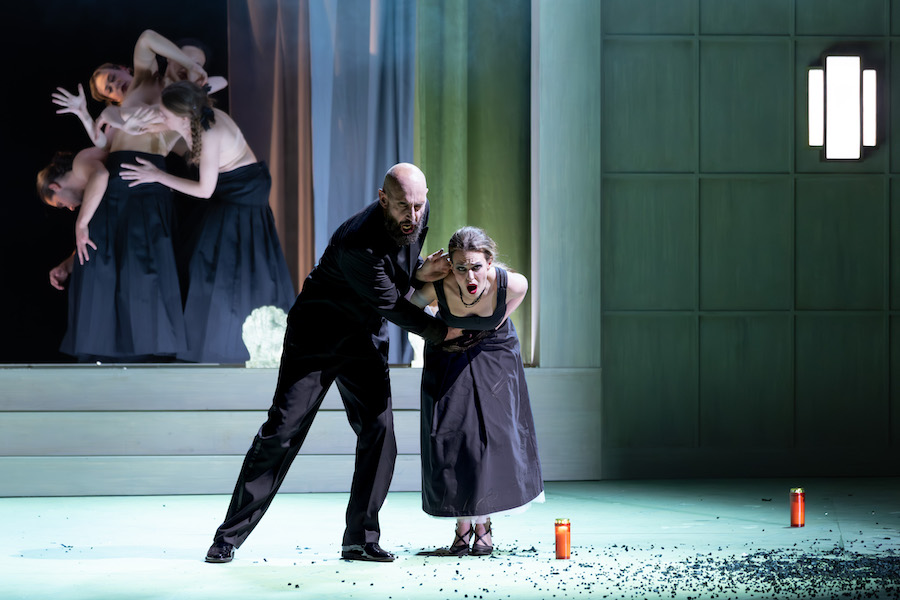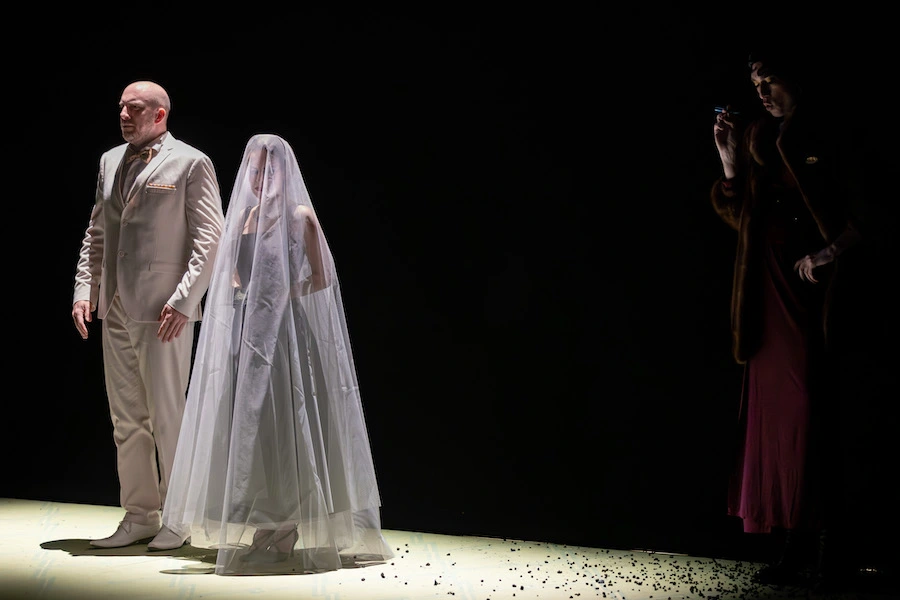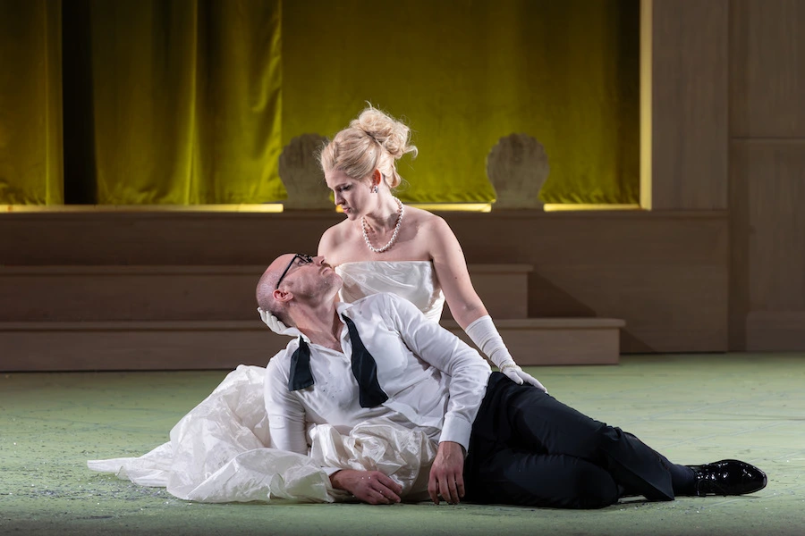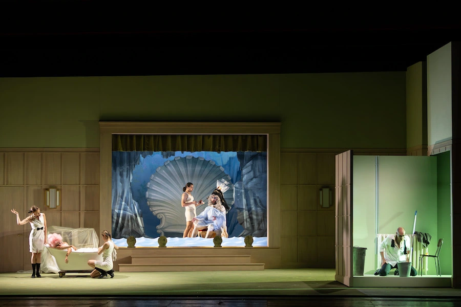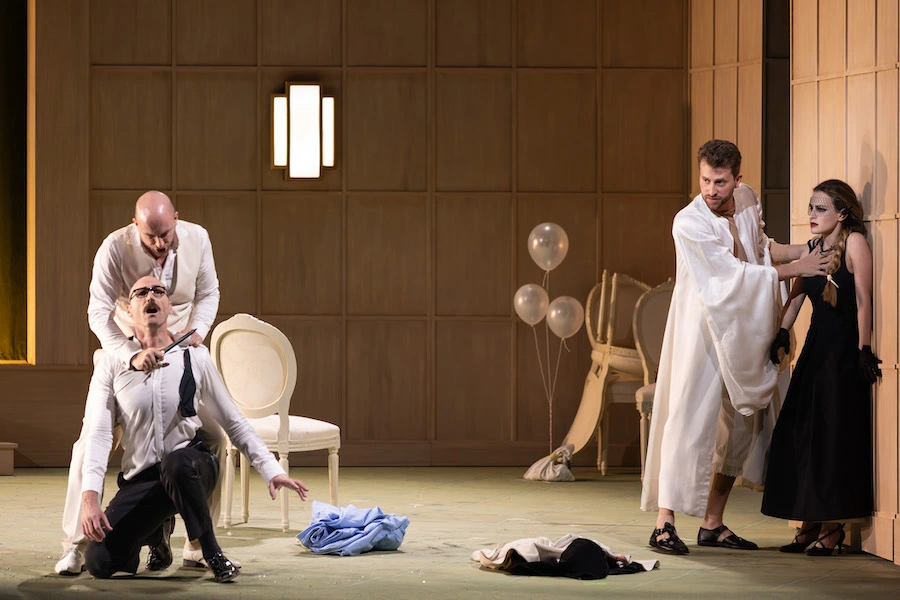 Sur le mur du fond de cette scène unique s’ouvre le proscenium d’un petit théâtre, d’où arrivent dieux et déesses pour plier les destinées humaines à leur volonté. Dans la scénographie d’Alberto Beltrame, la boiserie est parsemée de petites fenêtres pour laisser apparaître des têtes ou des objets, tandis que les tables et les chaises sont les seuls éléments mobiles sur scène. Le décor rappelle le film Melancholia de Lars von Trier et la robe de mariée blanche que Déjanire portera presque jusqu’à la fin est similaire. Avec les costumes splendides d’Elena Beccaro, modernes pour les humains et baroques pour les dieux, et l’éclairage soigné de Marco Alba, Bernard construit un spectacle techniquement parfait, ironique et visuellement délicieux, qui recrée l’esprit de l’opéra baroque en termes intelligemment modernes, avec un jeu fluide et efficace confié à des interprètes jeunes et vifs. Cette fois, les chorégraphies modernes de Giulia Tornarolli, interprétées ironiquement par les mimes/danseurs Andrea Carlotta Pelaia, Teodora Fornari et Vincenzo Giordano, sont agréables et jamais envahissantes. Après de nombreuses productions intéressantes, cette production permet à Andrea Bernard d’entrer dans le petit nombre des metteurs en scène les plus stimulants du moment.