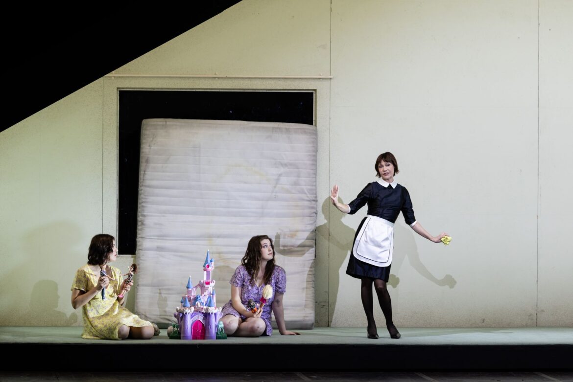 Une fois encore (cela doit bien durer depuis un quart de siècle maintenant…), on est obligé de subir la tyrannie de mises en scènes qui n’ont aucun respect pour les œuvres qu’elles sont censées servir. C’est ainsi que ce Cosi , dont la lecture scénique est signée Benedict Andrews, commence dans une immense chambre d’hôtel sordide où, pendant l’ouverture, Don Alfonso, en T-shirt et cagoule de cuir, avec à ses pieds un godemiché géant, prend des photos d’une prostituée à peine habillée ; cela est d’autant plus gratuit qu’Alfonso revêtira très vite un costume beaucoup plus traditionnel (chemise et costume noirs) jusqu’à la fin de l’opéra. Ce décor (conçu par Magda Willi) servira une bonne partie de l’acte avant d’être remplacé par une voiture garée dans un parking non moins sordide, puis un immense graffiti obscène (un sexe masculin éjaculant) couvrant tout le fond de scène. Viendront ensuite un château gonflable à la Disney et un petit parterre de fleurs. Le fil rouge du décor, incompréhensible, est un matelas posé au sol, qui va parcourir toute l’œuvre et auquel il sera mis feu lors du finale. Les faux turcs se sont métamorphosés en faux baba cools, Gugliemo et Ferrando étant partis à la guerre en treillis militaire. Les costumes des deux sœurs (signés Victoria Behr) frisent la vulgarité, ce qui somme toute est en accord avec les gestes et attitudes imposés par la mise en scène.