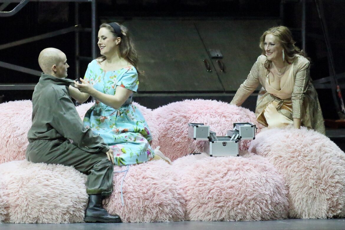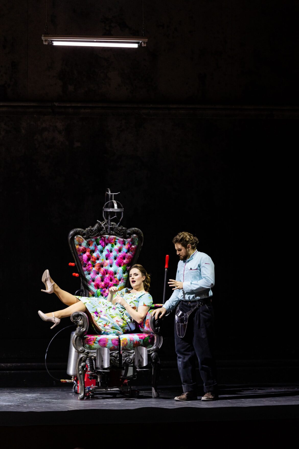 Les Noces de Figaro comptent parmi les titres du répertoire les plus fréquemment représentés. Souvent donc, les metteurs en scène sont en manque d’imagination. Pour cette reprise munichoise, le choix a été fait d’un décor quasi unique (les décors et costumes sont signés Annemarie Woods) : un grand panneau métallique vaguement rouillé percé d’une porte. Sont juste ajoutés trois éléments : au 1er acte un grand fauteuil baroque coloré qui s’ouvre par moments, laissant apparaître une série de godemichés tournants ; au 2e acte des échafaudages et un début de peinture rose sur la paroi, en phase avec un grand fauteuil rose ; au 3e acte un bureau art déco ; au 4e une série de pins en pots. Cela ne nuit pas à la mise en scène, celle-ci (signée Evgeny Titov, qu’on présente parfois comme « le nouveau Tcherniakov » et qui signera Lucie de Lammermoor la saison prochaine à l’Opéra- Comique) étant-elle-même inexistante ; on en retiendra une seule bonne idée : la transition sans coupure entre la fin du troisième acte et sa fête, et l’air admirablement chanté par Barberine (Eirin Rognerud ) : « L’ho perduta, me meschina » qui ouvre le quatrième acte.