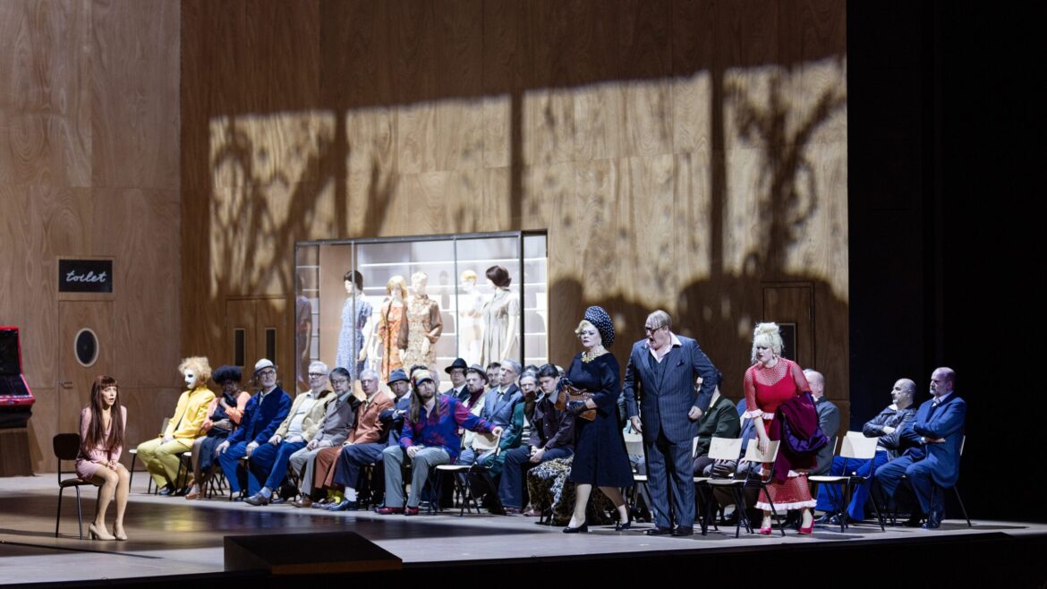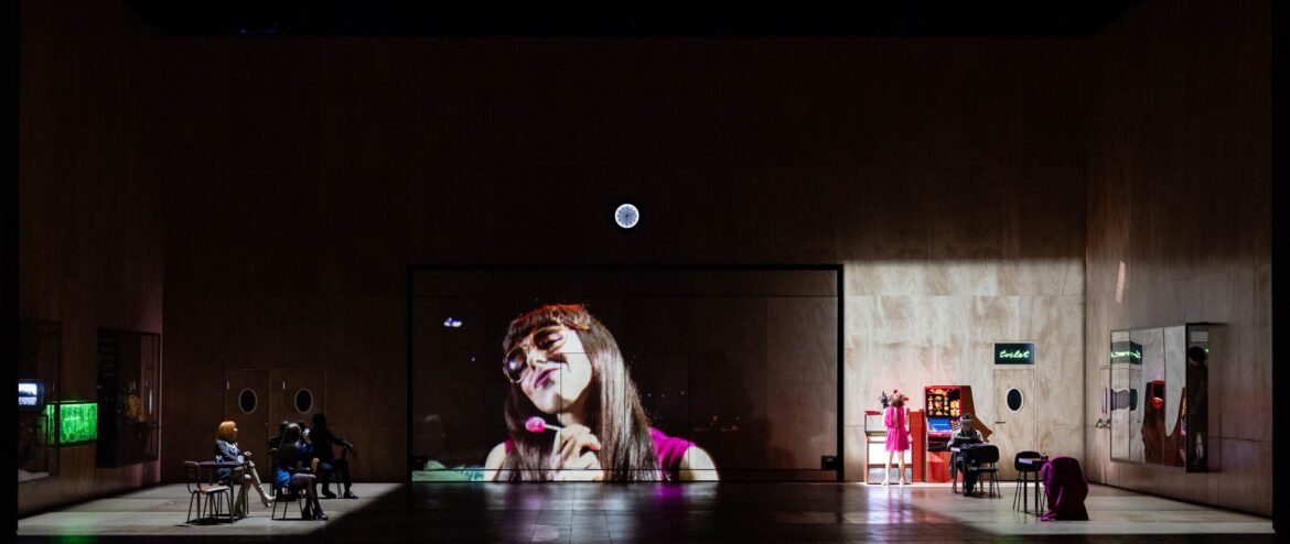 Si les visions scéniques proposées par Krzysztof Warlikowski atteignent parfois un degré élevé d’incongruité, force est de constater qu’ici sa lecture de l’œuvre peut parfaitement emporter l’adhésion. Depuis des décennies, l’usage fait que le décor unique de Katya Kabanova doit être le plus oppressant possible, avec un plafond bas et des parois resserrées pour évoquer l’atmosphère étouffante de l’œuvre. Ici c’est tout le contraire : le décor ouvert, conçu par Małgorzata Szczęśniak, laisse voir toute la largeur et la profondeur de la scène, laissant un espace scénique vide. Est placé au fond un bar, enfermé dans un grand caisson dont la paroi centrale se referme par moments pour permettre la projection de vidéos, et une série de chaises. On pense alors à un grand hall de gare routière, et à ces road movies à l’atmosphère tout aussi étouffante. C’est dans cette scénographie inattendue pour l’œuvre que prend corps la vision du metteur en scène polonais : un pari réussi qui, in fine, s’avère réussi.