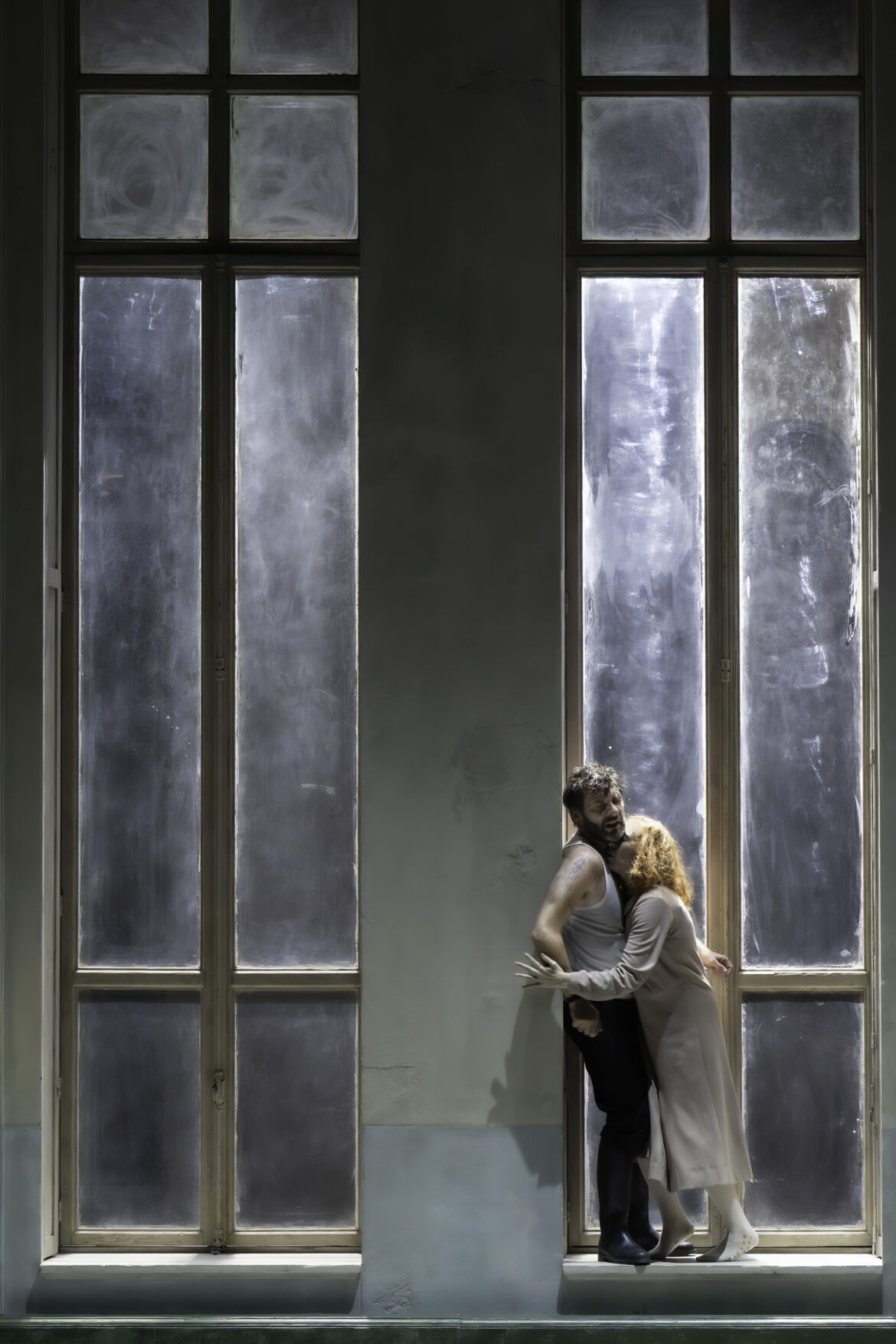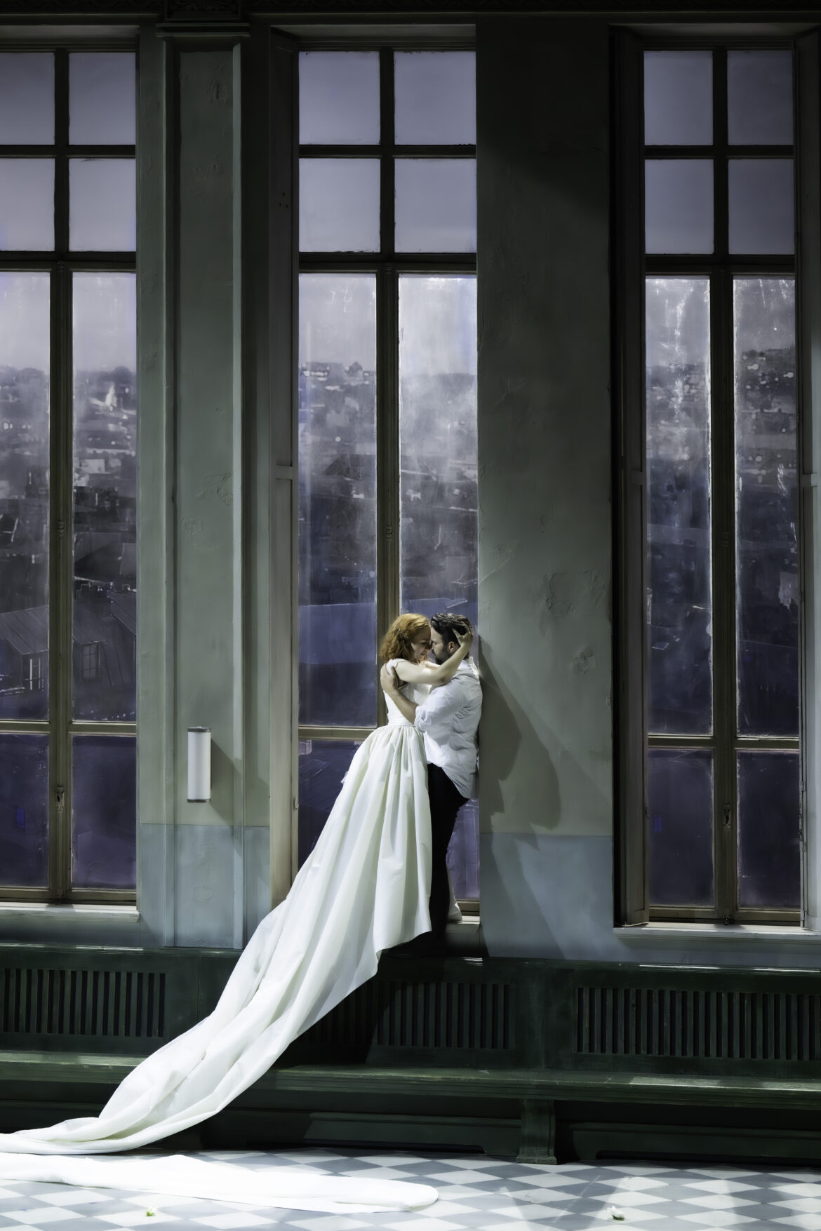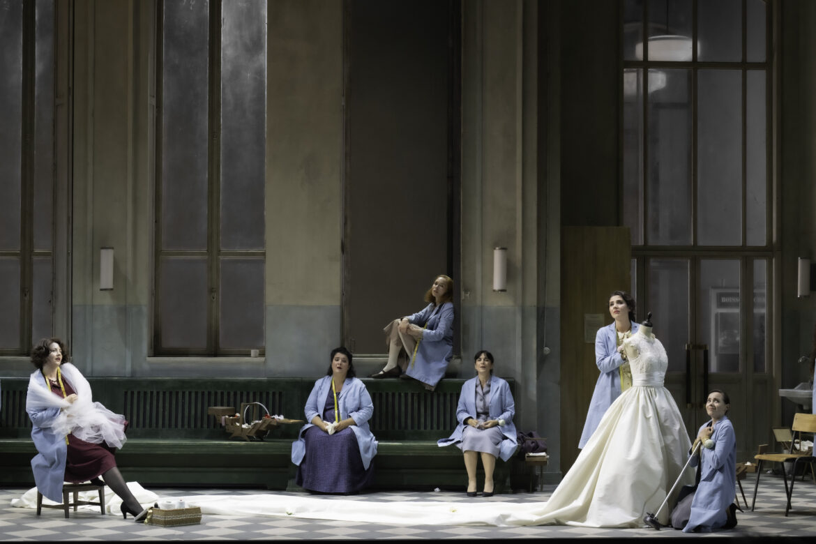 Le metteur en scène Christof Loy opte, lui, pour une reconstruction à rebours de l’itinéraire de la jeune Louise, initialement prostrée sur un banc, et retournant à cet état à la toute fin, encadrée par ses parents geôliers. Ce faisant, il renverse la table. Car tous les épisodes du « roman musical », conduisant notamment à l’émancipation de l’héroïne par l’amour et la liberté auprès de son amant Julien, sont ici des projections fantasmées, de réminiscences faisant écran à la relation incestueuse imposée par son pater. Le parti-pris tient la route sur les scènes entre Louise et ses parents (acte I), devenues violentes lorsqu’elle revient au chevet du père malade (acte IV) : ajout des attouchements du Père sur le corps de Louise lors de leur confrontation vocale. En cohérence de cette interprétation, la scénographie unique d’Étienne Pluss consiste en un vaste hall d’attente d’hôpital psychiatrique, glacial et anonyme. L’austérité de rigueur – bancs sous des lumières blanchâtres (Valerio Tiberi) – pèse également sur les attitudes raides du personnel. Quant aux costumes des années 70 (Robby Duiveman), ils opposent les blouses blanches à l’excentricité rock-and-roll du peuple montmartrois. Ainsi, la robe stricte de la jeune fille mute pour un accoutrement sexy lors de son passage à l’état de femme, couronnée en Muse de Montmartre par le peuple (III).