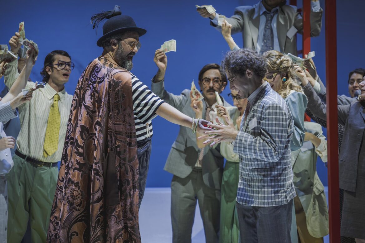 Roberto De Candia est quant à lui un chanteur et acteur accomplis qui, avec une diction excellente, débite la cavatine d’entrée fantasmagorique du Docteur Dulcamara, le charlatan qui vend un élixir miraculeux pour trois lires, un remède que le naïf Nemorino croit être le philtre d’amour de la reine Isolde. Le metteur en scène Roberto Catalano transpose l’action dans le décor contemporain d’un parc public de banlieue, faisant d’Adina, riche et capricieuse fermière dans le brillant livret de Felice Romani, une gestionnaire de carrière parfois un peu trop irritable, tandis que Nemorino est l’ouvrier d’entretien du parc, et que les paysans et les filles de la campagne environnantes se transforment en une ribambelle de commis et de secrétaires. Le chœur du Maggio Musicale Fiorentino s’adapte également à cette situation inédite, chantant et jouant magnifiquement. Le Docteur Dulcamara n’arrive pas dans un carrosse doré comme dans le livret ; dans l’interprétation de Roberto Catalano, il s’agit plutôt d’une sorte d’artiste vagabond, un peu surréaliste, vêtu d’une chemise rayée légèrement clownesque comme celle de Gelsomina dans La Strada de Fellini, avec un mégaphone dont le metteur en scène le fait peut-être un peu abuser. Je pense pour ma part que le comique du personnage est d’autant plus explosif que ses interprétations sont sérieuses, contrastant avec ses discours pompeux et absurdes, mais De Candia, avec son jeu raffiné et son phrasé très précis, parvient à rendre cette version crédible et attachante.