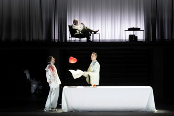 Le cœur est la grande affaire de l’opéra. Il est partout. Dans le pré-générique donc ; dans ses battements sonores récurrents qui loin de phagocyter la musique mozartienne créent un univers aux sonorités électroacoustiques subtilement enchâssées ; dans la boîte de chocolat offerte à l’enfant ; dans les mots de Leporello à son Maître (« Vous n’avez donc pas de cœur») ; dans ce moment symbolique, inattendu et poétique, lors du banquet final où le premier plat apporté sur la table est couvert d’un linge qui, enlevé, laisse échapper un ballon rouge en forme de cœur qui s’envole dans les cintres… Don Juan n’a plus de cœur et il en meurt lorsque, symboliquement, voici qu’il donne la main à son double. Car le dramma giocoso est sinistre et Leporello le souligne à la toute fin : « Nous sommes tous morts ! ».